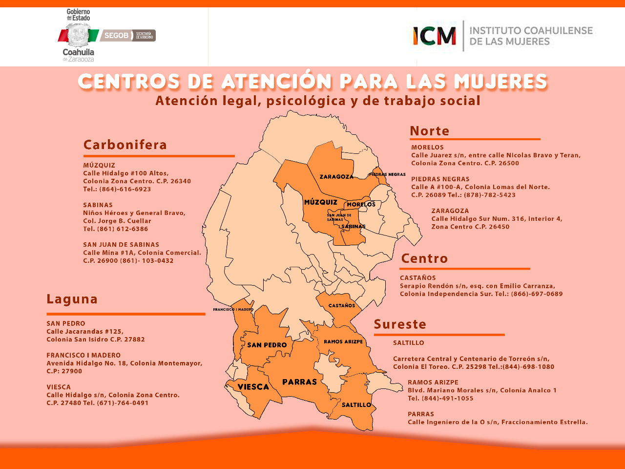 En la Carbonífera se cuenta con tres módulos: uno en el Municipio de Múzquiz, en la calle Hidalgo #100 Altos, Colonia Zona Centro, C.P. 26340, el teléfono de atención es 864 616 6923; en Sabinas está ubicado en la calle Niños Héroes y General Bravo, Col. Jorge B. Cuéllar, teléfono 861 612 6386; y en San Juan de Sabinas en la calle Mina #1A, Colonia Comercial, C.P. 26900, 861 103 0432.