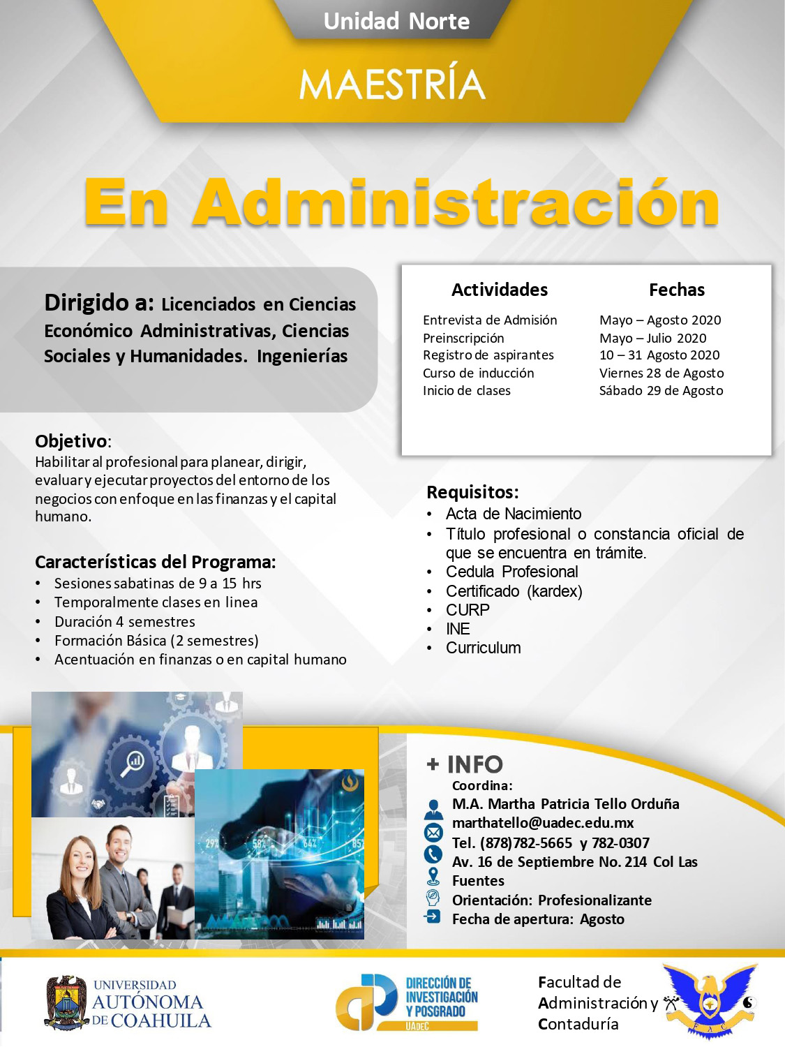 PIEDRAS NEGRAS, Coahuila; 11 de junio de 2020.- La Universidad Autónoma de Coahuila, a través de la Facultad de Administración y Contaduría, Unidad Norte en Piedras Negras, convoca a cursar la Maestría en Administración, con acentuación en Finanzas y Capital Humano, con duración de dos años.