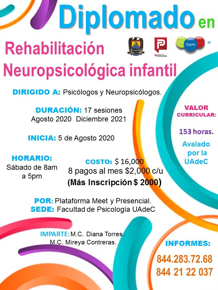 SALTILLO, Coahuila; 20 de julio de 2020.- La Facultad de Psicología de la Universidad Autónoma de Coahuila, en coordinación con el Centro de Orientación Psicológica, Pedagógica y Tanatológica (OPPTA), convocan a participar en el Diplomado en Rehabilitación Neuropsicológica Infantil.