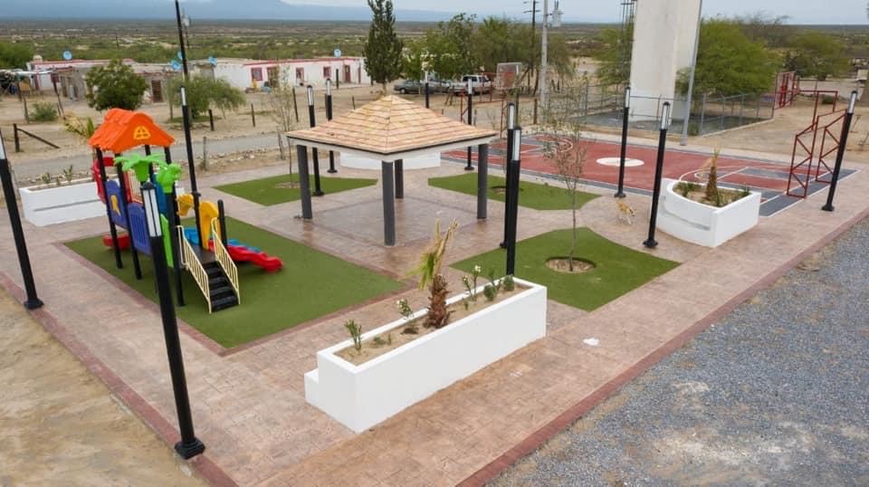 Visita Chema Morales las comunidades rurales de Hipólito y Sauceda, supervisar la entrega de los conjuntos de plaza y cancha.