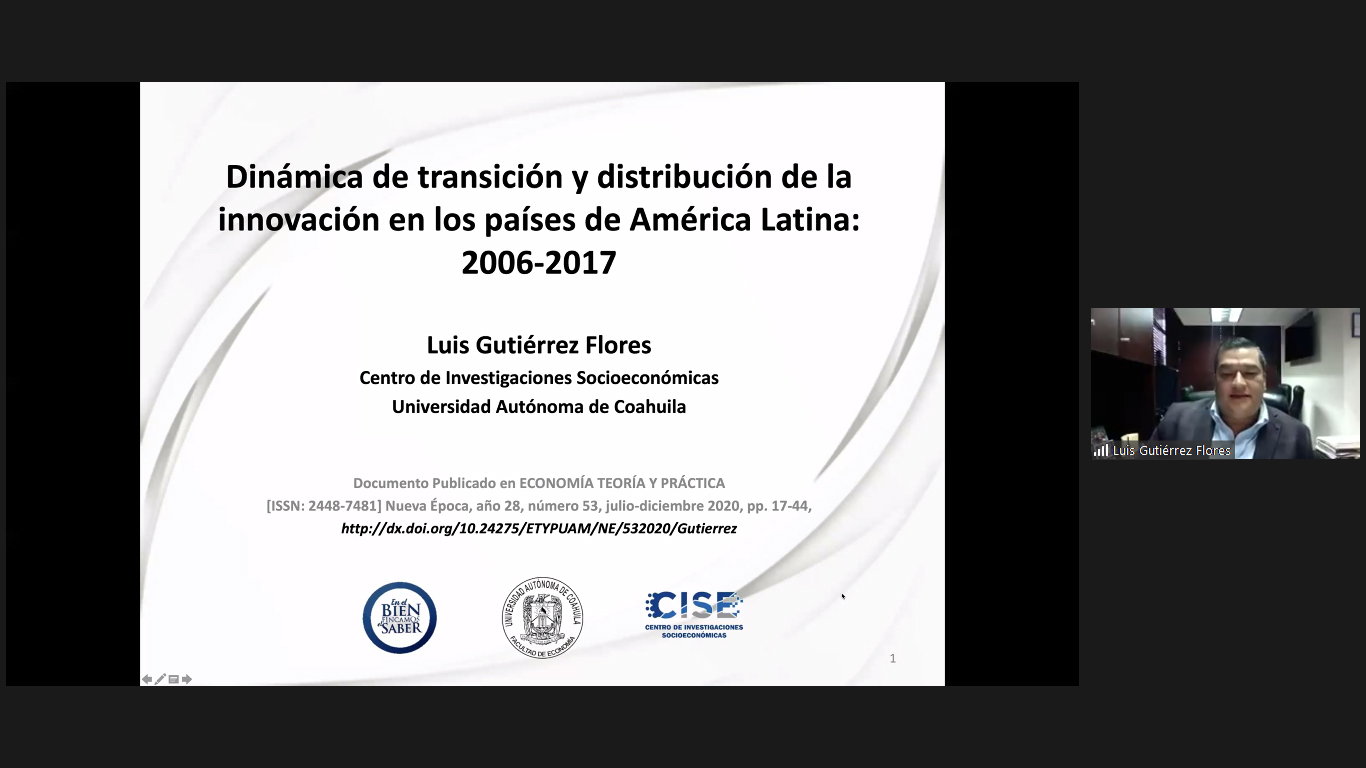 SALTILLO, Coahuila; 11 de septiembre de 2020.- Como parte de las actividades de celebración por el aniversario LIII de la Facultad de Economía de la Universidad Autónoma de Coahuila, se impartió la conferencia "Dinámica de transición y distribución de la innovación en los países de América Latina: 2006-2017" a cargo del Dr. Luis Gutiérrez Flores.