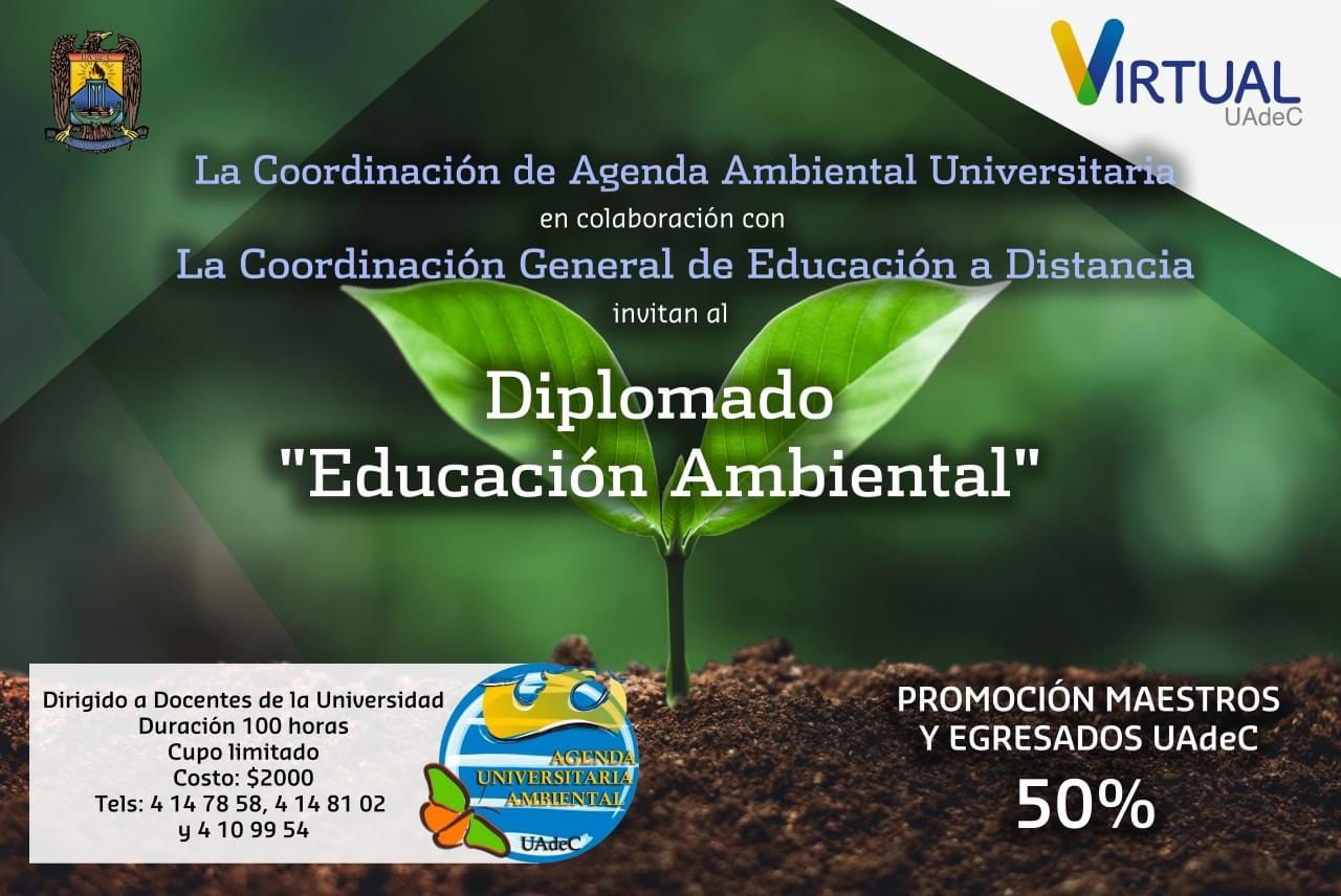 SALTILLO, Coahuila; 14 de septiembre de 2020.- La Universidad Autónoma de Coahuila, a través de la Coordinación General de Educación a Distancia y la Agenda Universitaria Ambiental, convoca a los docentes a cursar el Diplomado de Educación Ambiental en Línea, que iniciará el próximo 28 de septiembre.