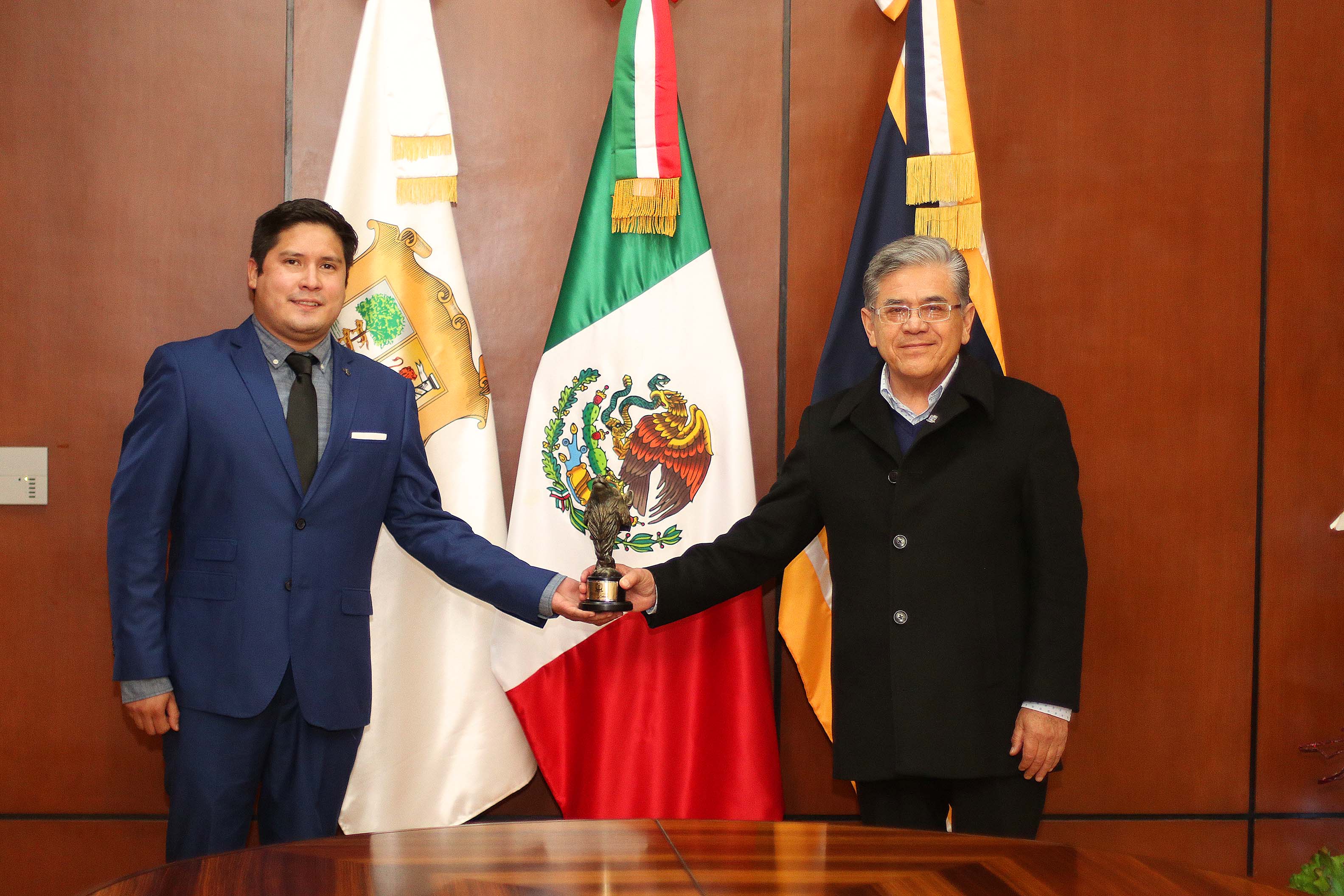 Además, el rector de la UAdeC, Salvador Hernández Vélez, entregó a Rogelio Perales una estatuilla como símbolo de reconocimiento por su destacada labor y lo felicitó por poner en alto el nombre de la Universidad, exhortándolo a continuar trabajando como hasta ahora y seguir cosechando éxitos.