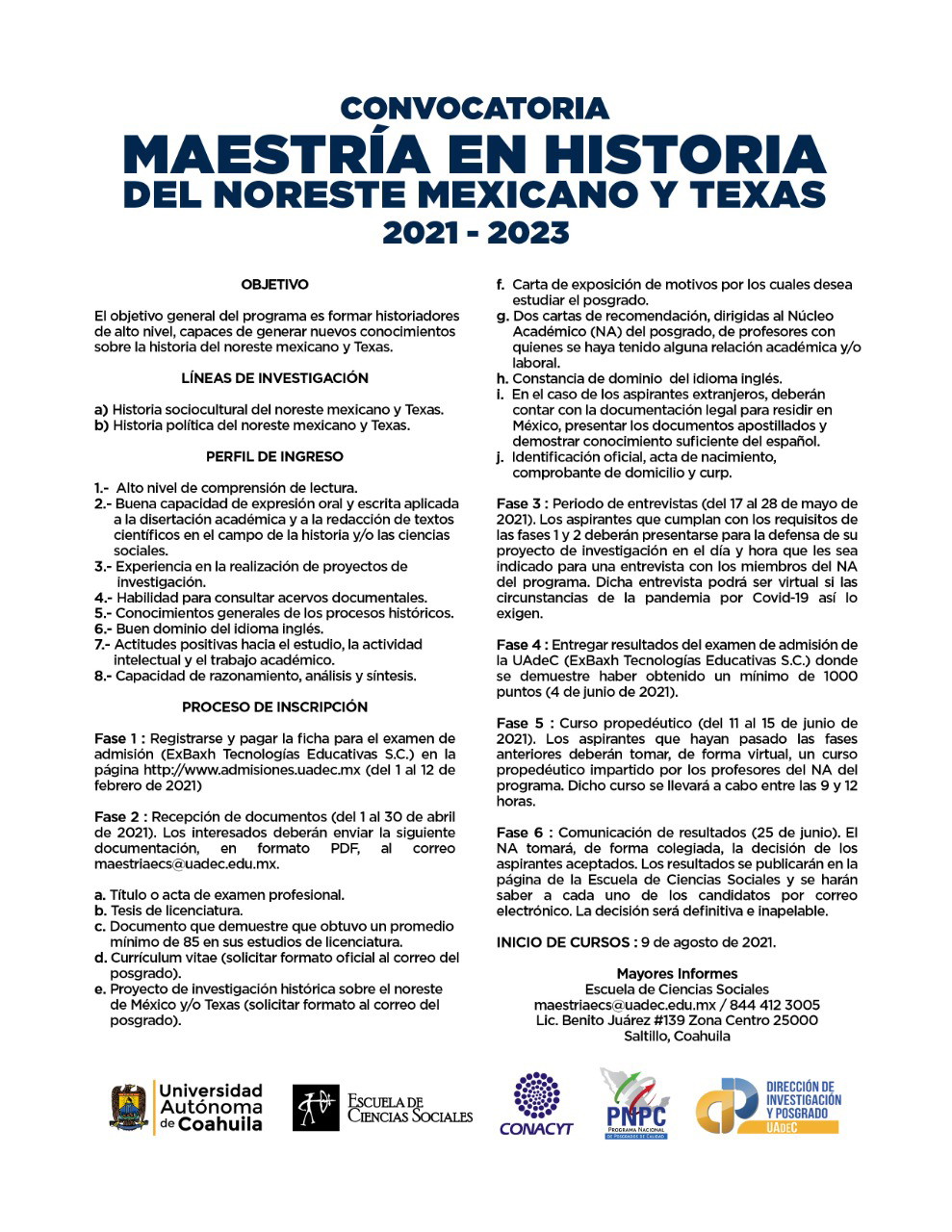 SALTILLO, Coahuila; 2 de febrero de 2021.- Con el fin de formar investigadores especializados en el Noreste de México y Texas, la Escuela de Ciencias Sociales de la Universidad Autónoma de Coahuila convoca a estudiar la Maestría en Historia del Noreste Mexicano y Texas para el periodo 2021-2023.