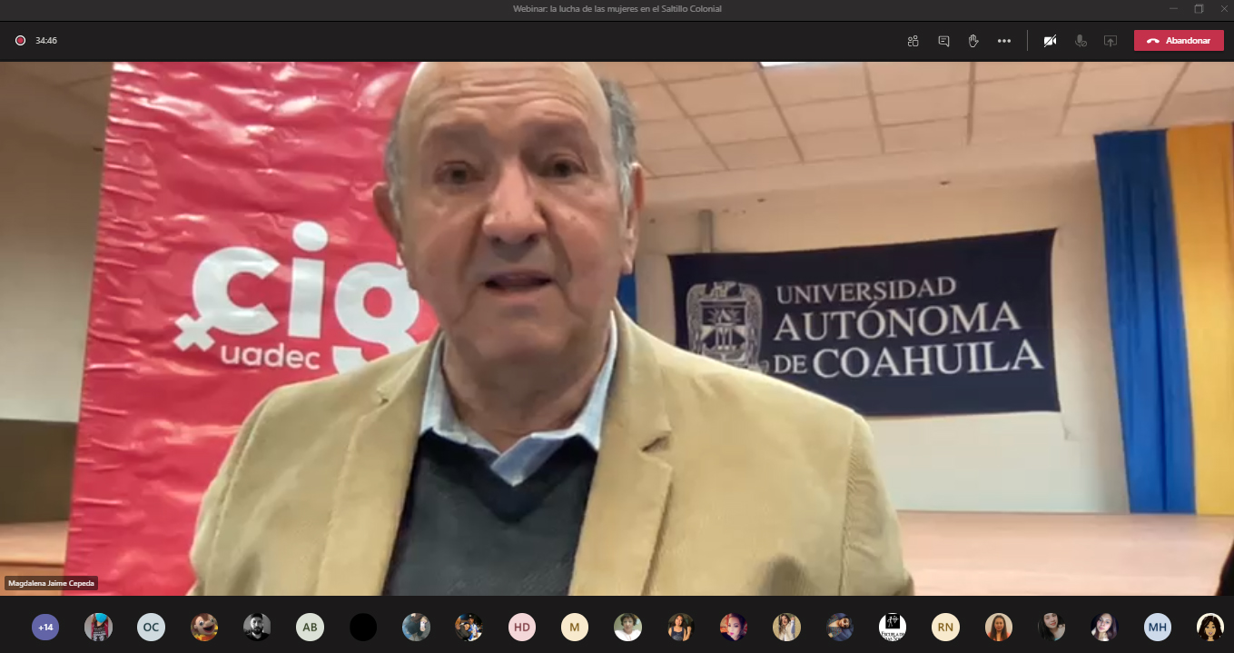 A través de la plataforma TEAMS y Facebook Live, el historiador y catedrático de la Escuela de Ciencias Sociales de la UAdeC, compartió con los asistentes una charla en la que destacó algunos de los resultados de investigaciones propias y de colaboradores en torno al papel de la mujer en la historia de Saltillo.