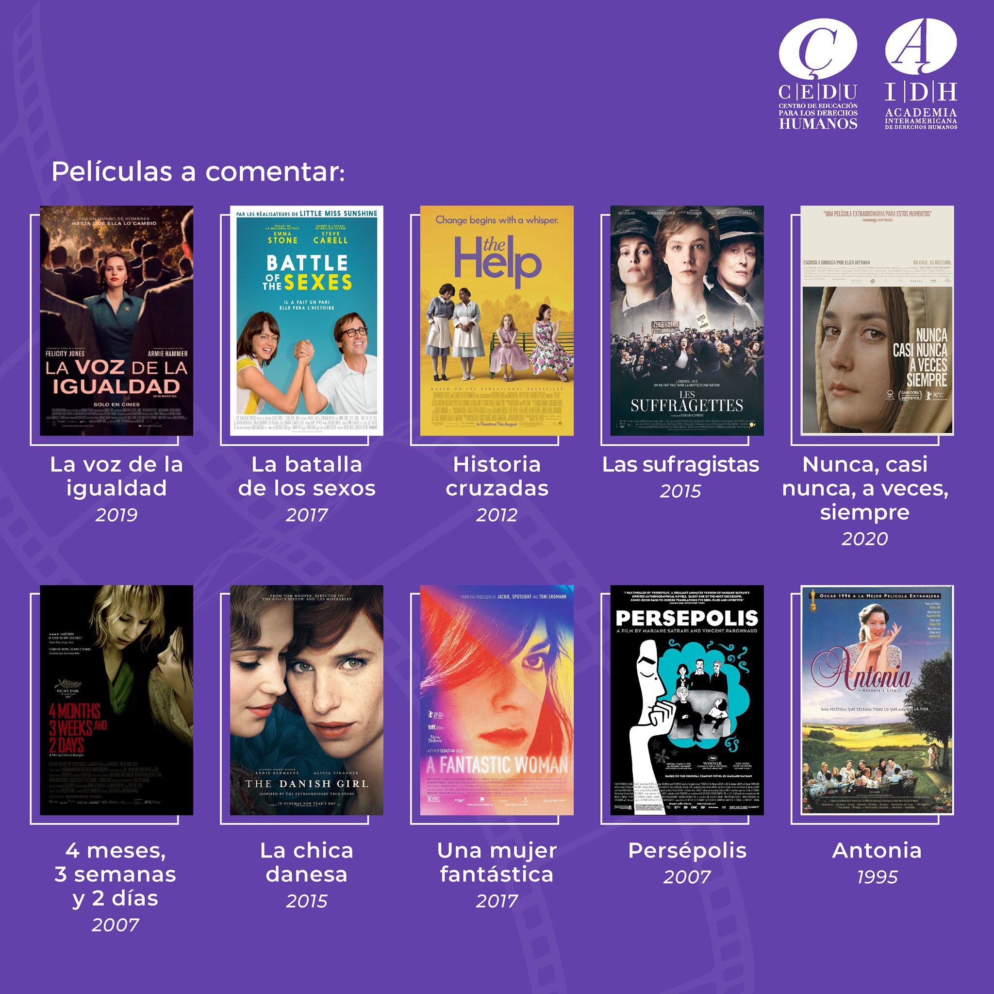 La distribución de las películas que se analizarán será la siguiente: La voz de la igualdad, La batalla de los sexos, Historias cruzadas, Las sufragistas, Never rarely sometimes always, 4 meses, 3 semanas y 2 días, La chica danesa, Una mujer fantástica, Persépolis y Antonia.