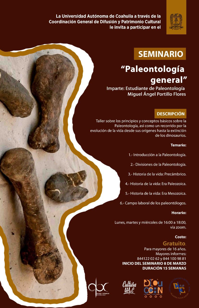 SALTILLO, Coahuila; 25 de febrero de 2021.- La Universidad Autónoma de Coahuila a través de la Coordinación General de Difusión y Patrimonio Cultural invitan al Seminario "Paleontología General" que será impartido por el estudiante en paleontología, Miguel Ángel Portillo Flores.