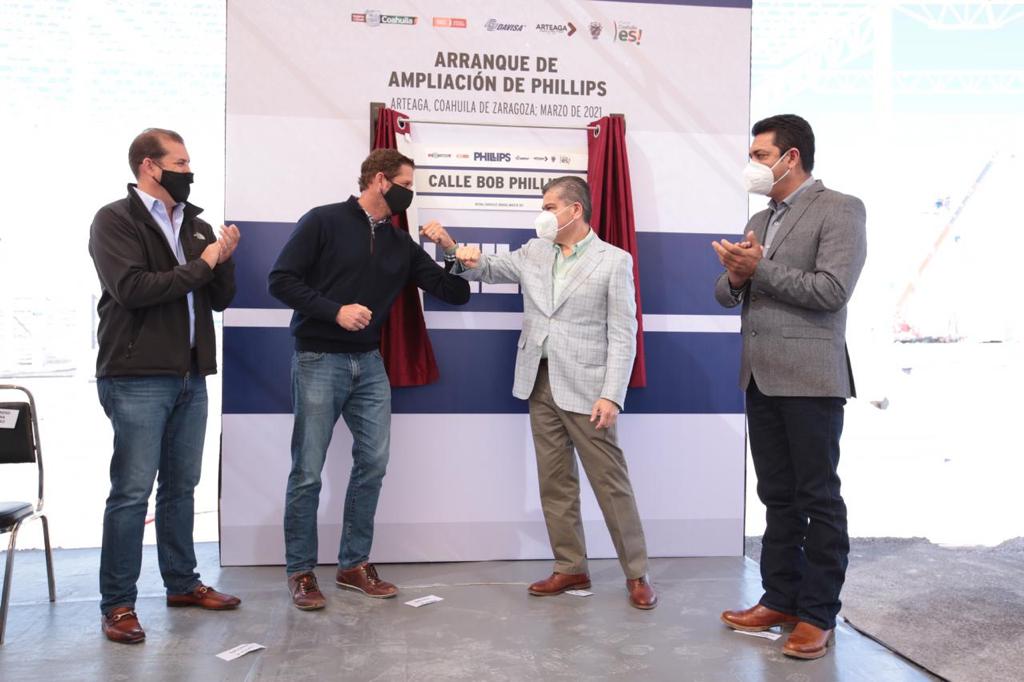El Gobernador de Coahuila develó la nomenclatura con el nombre de Bob Phillips, de la avenida que da acceso a la planta desde el Bulevar Fundadores, y estuvo acompañado por altos directivos de la compañía encabezados por Robert A. Phillips y David A. Phillips, así como por Everardo Durán, Alcalde de Arteaga; Jaime Guerra Pérez, Secretario de Economía del Estado; la senadora Verónica Martínez García; la diputada Edna Dávalos y el líder estatal de la CTM, Tereso Medina.