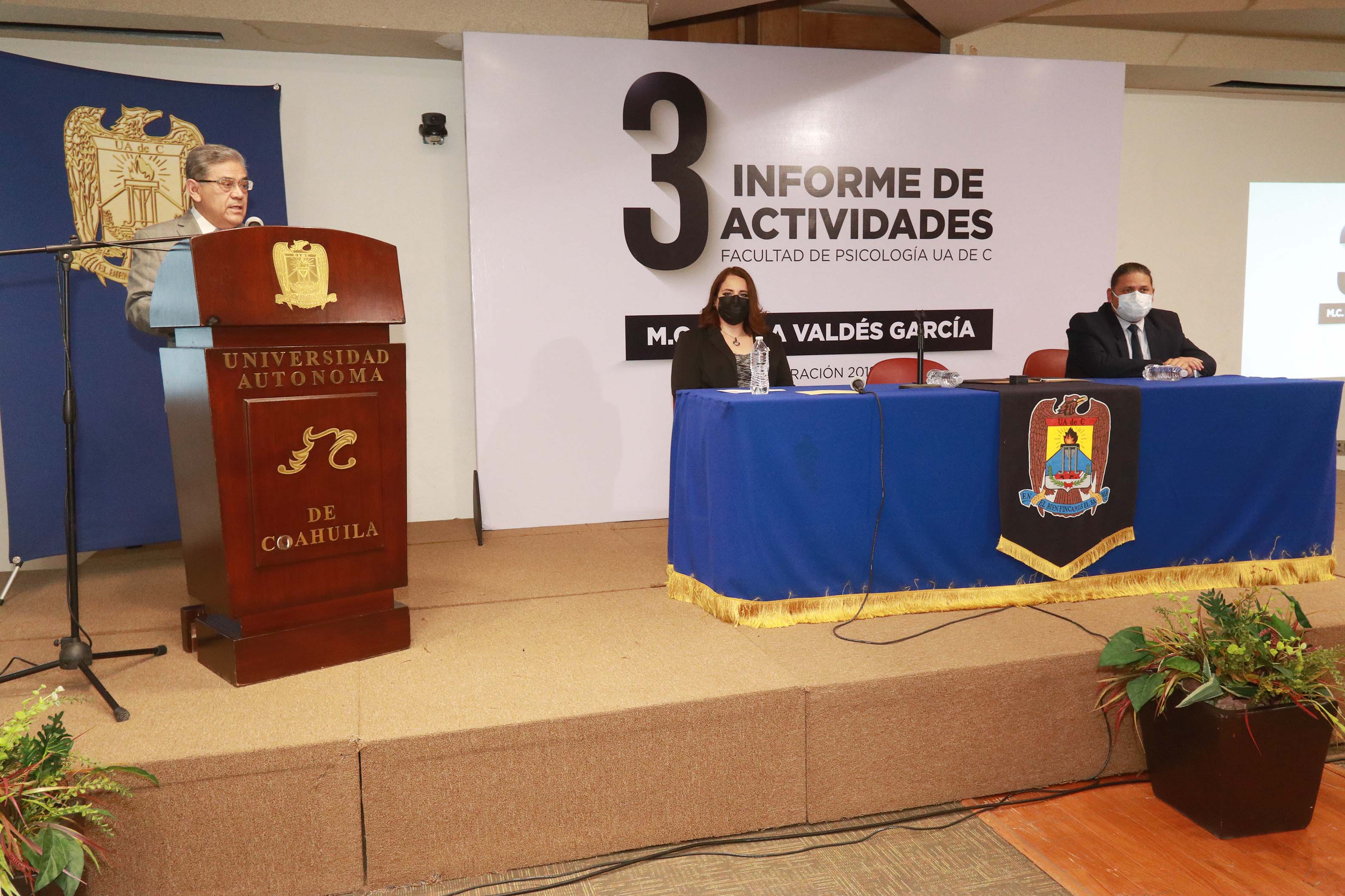 SALTILLO, Coahuila. 16 de marzo de 2021.- La directora saliente de la Facultad de Psicología Unidad Saltillo de la Universidad Autónoma de Coahuila, la Mtra. Karla Patricia Valdés García, rindió este martes su tercer informe de actividades de su segundo periodo, mientras que la Mtra. Ana Berenice de la Peña Aguilar tomó protesta como nueva directora.