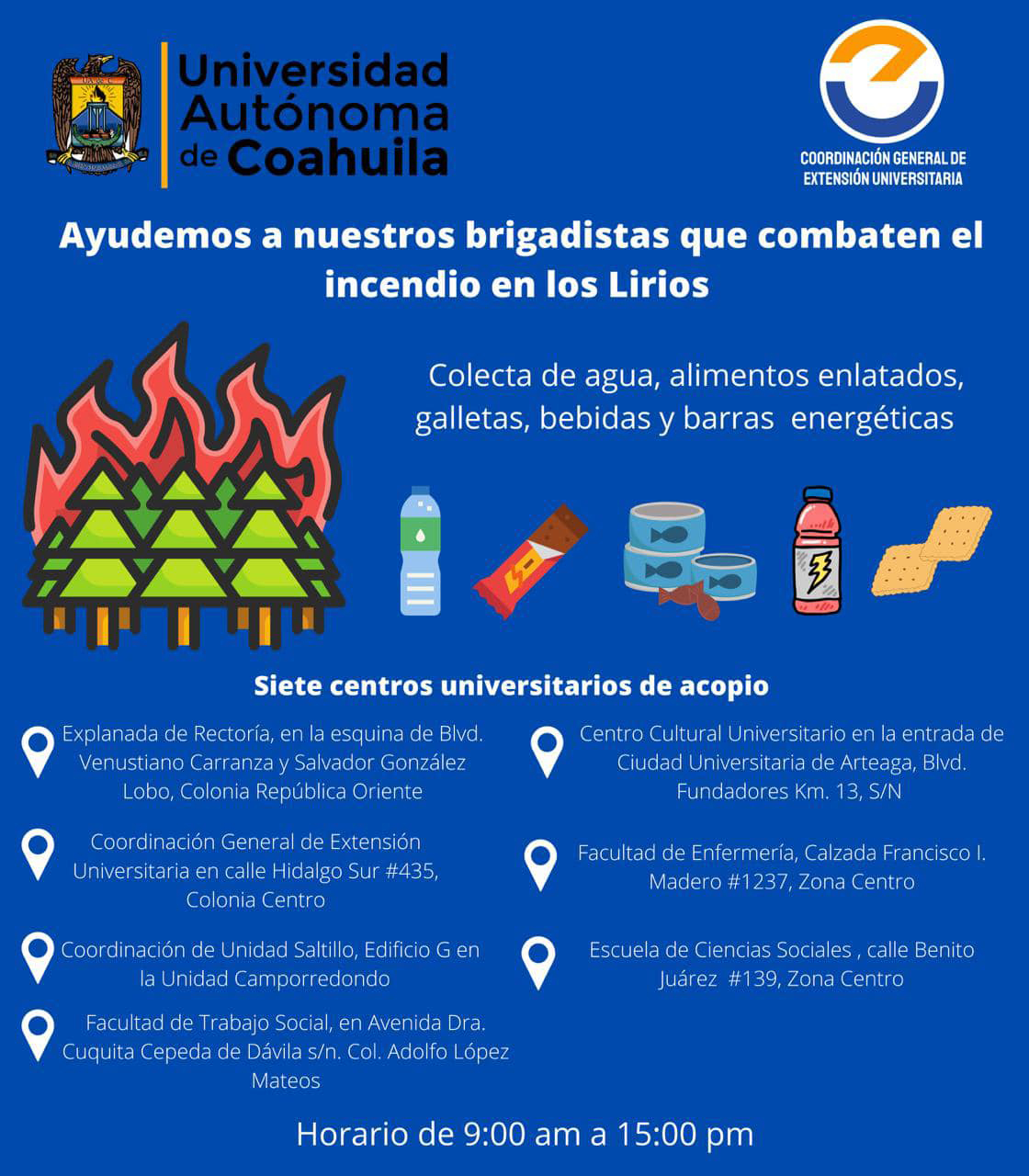 La colecta en la máxima casa de estudios continúa, y por ello se exhorta a maestros, alumnos y trabajadores de la UAdeC y comunidad en general a sumarse a la colecta para el personal que combate el incendio forestal.