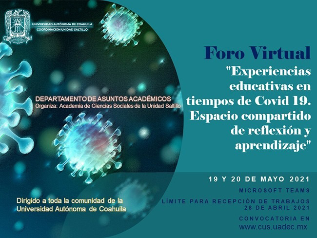 SALTILLO, Coahuila. 19 de abril de 2021.- Los días 19 y 20 de mayo a través de Microsoft Teams, la Universidad Autónoma de Coahuila llevará a cabo el Foro virtual “Experiencias Educativas en Tiempos de Covid-19: Espacio Compartido de Reflexión y Aprendizaje”, lo convoca la Coordinación de Unidad Saltillo (CUS), e invita a participar como ponentes a alumnos, docentes y colaboradores universitarios.