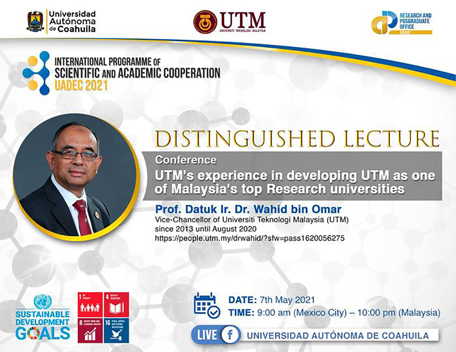 No te pierdas esta primera conferencia del “Programa Internacional de Cooperación Científica y Académica 2021”, en punto de las 9:00 horas (tiempo central de México) y 22:00 horas (tiempo local en Malasia) por el Facebook Live de la UAdeC.