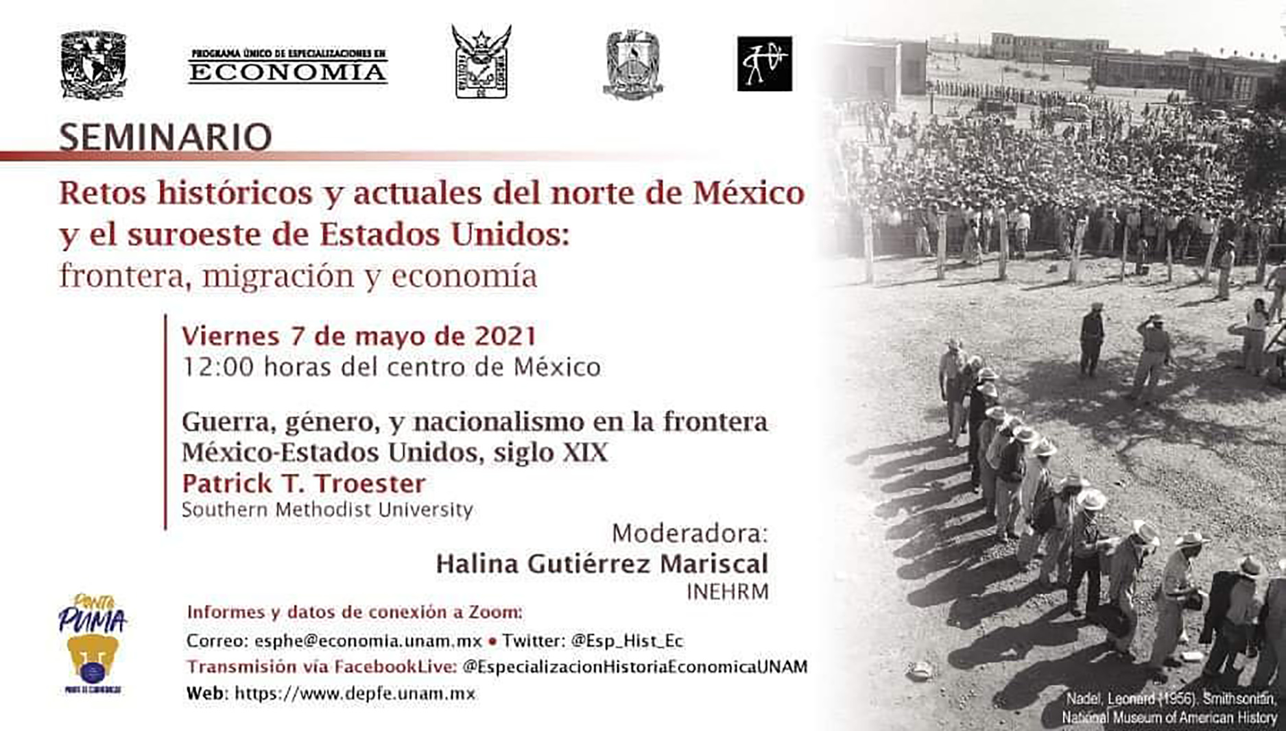 SALTILLO, Coahuila. 6 de mayo de 2021.- La Escuela de Ciencias Sociales de la Universidad Autónoma de Coahuila a través de la Maestría en Historia del Noreste Mexicano y Texas, en conjunto con la Universidad Nacional Autónoma de México y su Especialización en Historia Económica, invitan al Seminario “Retos Históricos y Actuales del Norte de México y el Suroeste de Estados Unidos: frontera, migración y economía”.