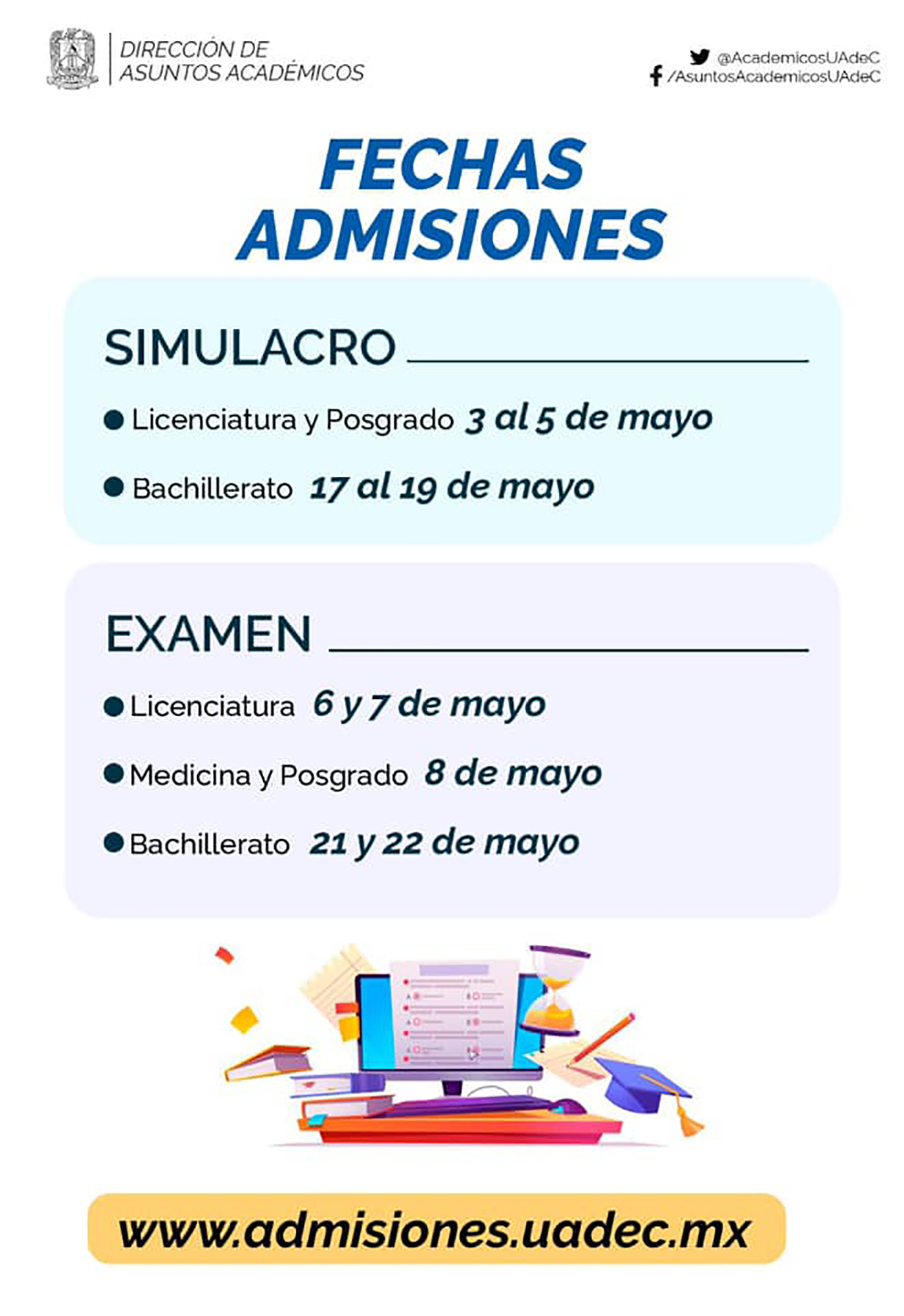 Para cualquier duda o aclaración sobre el examen de admisión a la UAdeC, ingresar a http://www.admisiones.uadec.mx/, en el apartado de “Preguntas Frecuentes” o comunicarse al teléfono del departamento de Admisiones y Orientación Educativa de la Dirección de Asuntos Académicos en horario de 9:00 a 15:00 horas: (844) 4 38 16 55.