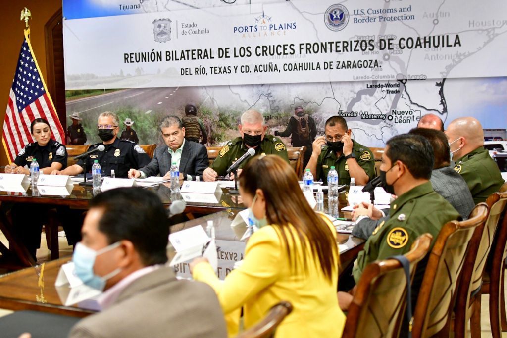 Del Río, Texas, EU; a 6 de Mayo de 2021.- El gobernador Miguel Ángel Riquelme Solís participó en la Reunión Binacional de Seguridad y Cruces Fronterizos con autoridades de Aduana de Estados Unidos para revisar la estrategia bilateral que impulsa el flujo de transporte comercial en el puerto fronterizo Acuña-Del Río, Texas.En su intervención, anunció que se está trabajando en el desarrollo de los libramientos del Corredor Económico del Norte, que potencializará a Coahuila como uno de los estados más competitivos de México.