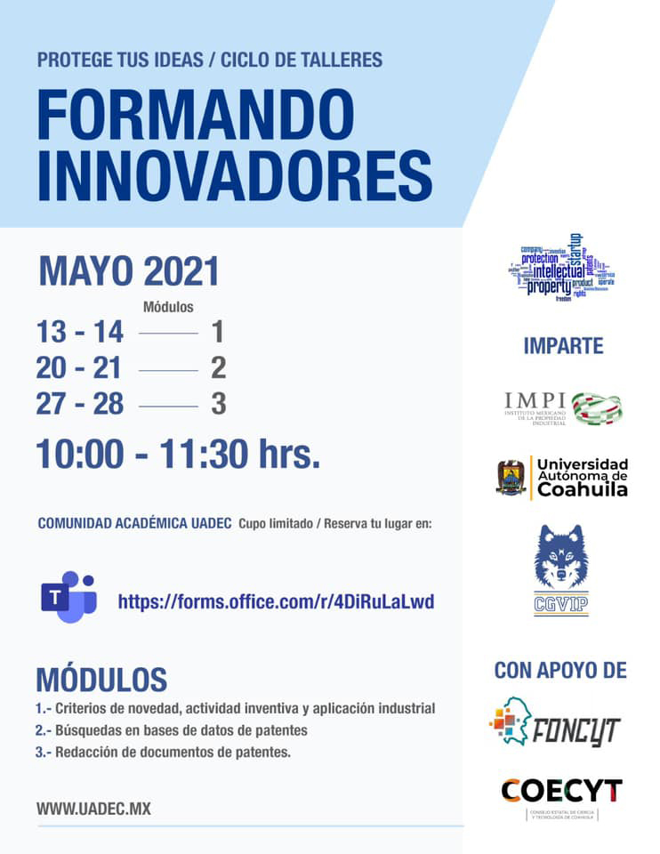 Los talleres se impartirán en tres módulos, divididos en dos sesiones por día en horario de 10:00 a 11:30 horas a partir del 13 y 14 de mayo, donde se abordará el primer tema “Criterios de novedad, actividad inventiva y aplicación industrial”; el 20 y 21 de mayo, “Búsquedas en bases de datos de patentes”, mientras que el 27 y 28 de mayo, “Redacción de documentos de patentes”.
