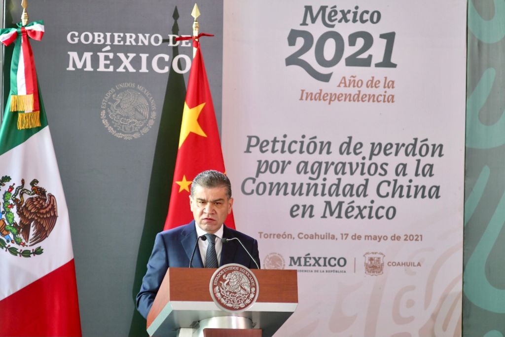 Torreón, Coahuila de Zaragoza; a 17 de Mayo de 2021.- El presidente Andrés Manuel López Obrador y el Gobernador de Coahuila, Miguel Ángel Riquelme Solís, se unieron en la Petición de Perdón a la Comunidad China en México."Con el mayor respeto y responsabilidad nos unimos a la Petición de Perdón a la Comunidad China", expresó Riquelme Solís, mientras el presidente López Obrador destacó la imperante obligación de asumir la responsabilidad con el pueblo chino, a lo que el Embajador de China en México, Zhu Qingqiao, agradeció la ceremonia de hoy, que cura cicatrices de la historia.
