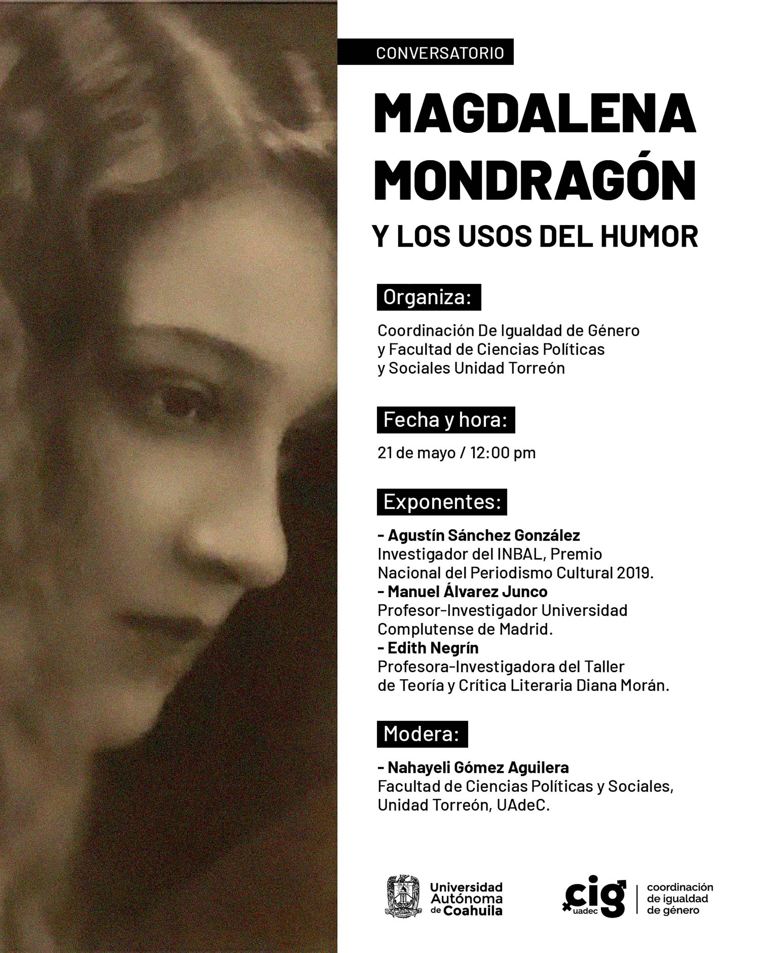 SALTILLO, Coahuila. 20 de mayo de 2021.- La Coordinación de Igualdad de Género y la Facultad de Ciencias Políticas y Sociales Unidad Torreón de la Universidad Autónoma de Coahuila, invitan a la comunidad universitaria a participar en el conversatorio “Magdalena Mondragón y los usos del humor”, este viernes 21 de mayo a las 12:00 horas por medio de Microsoft Teams.