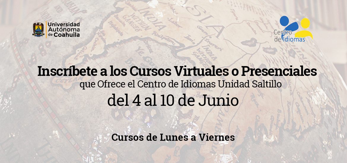 SALTILLO, Coahuila. 2 de junio de 2021.- El Centro de Idiomas Unidad Saltillo de la Universidad Autónoma de Coahuila, abrirá del 4 al 10 de junio de 2021 las inscripciones para los cursos virtuales o presenciales entre semana de inglés, alemán, francés e italiano para el periodo del 14 de junio al 6 de agosto de 2021.