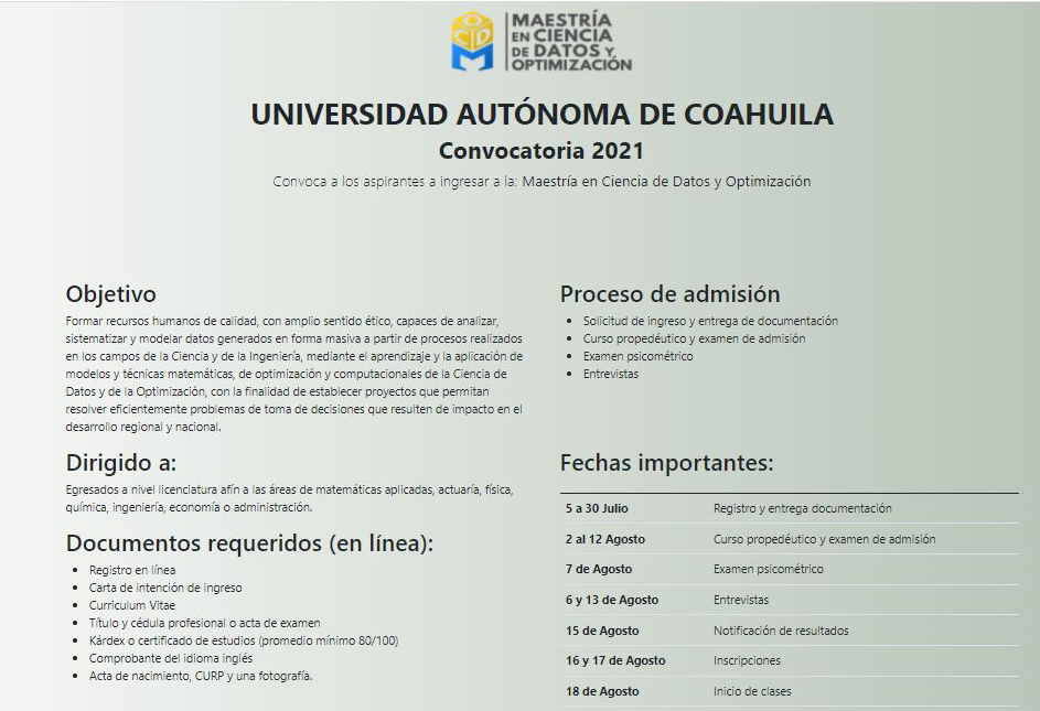 SALTILLO, Coahuila. 5 de julio de 2021.- Con el fin de formar recursos humanos de calidad, capaces de analizar, sistematizar y modelar datos generados en los procesos realizados en los campos de la Ciencia y de la Ingeniería, el Centro de Investigación en Matemáticas Aplicadas (CIMA) de la Universidad Autónoma de Coahuila abre hoy el registro para aspirantes interesados en cursar la Maestría en Ciencia de Datos y Optimización en el semestre agosto-diciembre 2021.
