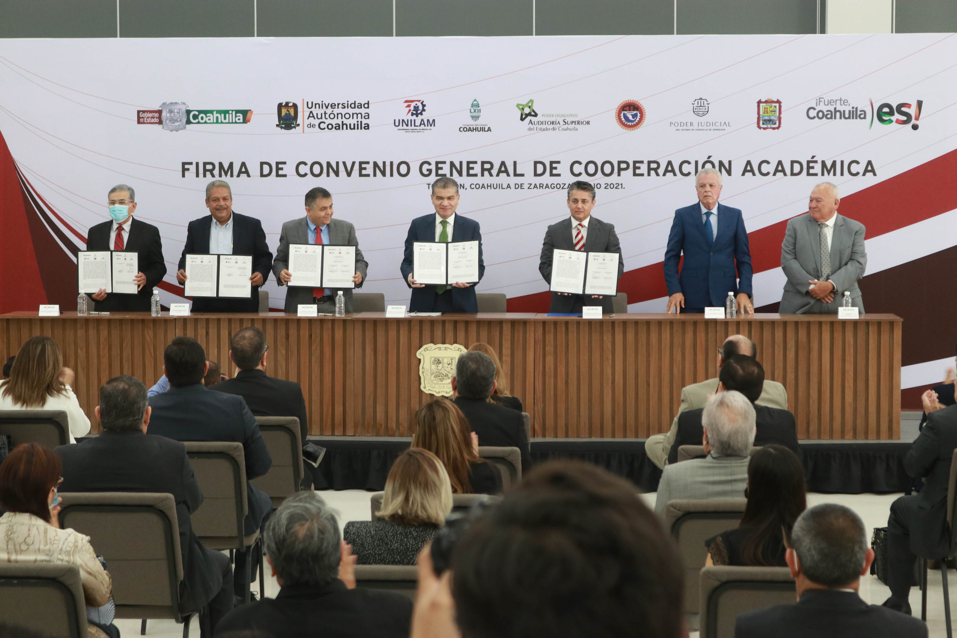 El convenio fue signado por el gobernador del estado de Coahuila, Miguel Ángel Riquelme Solís, el rector de la máxima casa de estudios, Salvador Hernández Vélez, el diputado y presidente de la Junta de Gobierno del Congreso del Estado, Eduardo Olmos Castro, el Magistrado Presidente del Tribunal Superior de Justicia del Estado, Miguel Mery Ayup y el secretario general de la Confederación de Trabajadores de México (CTM) delegación Coahuila, Tereso Medina Rodríguez.