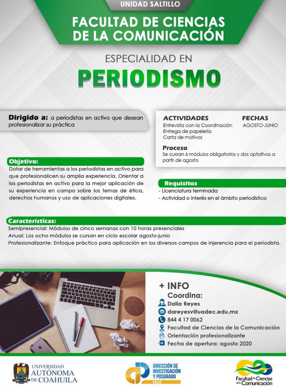 SALTILLO, Coahuila. 19 de julio de 2021.- La Facultad de Ciencias de la Comunicación de la Universidad Autónoma de Coahuila convoca a periodistas en activo a inscribirse a la Especialidad en Periodismo para el ciclo escolar agosto-diciembre de 2021.