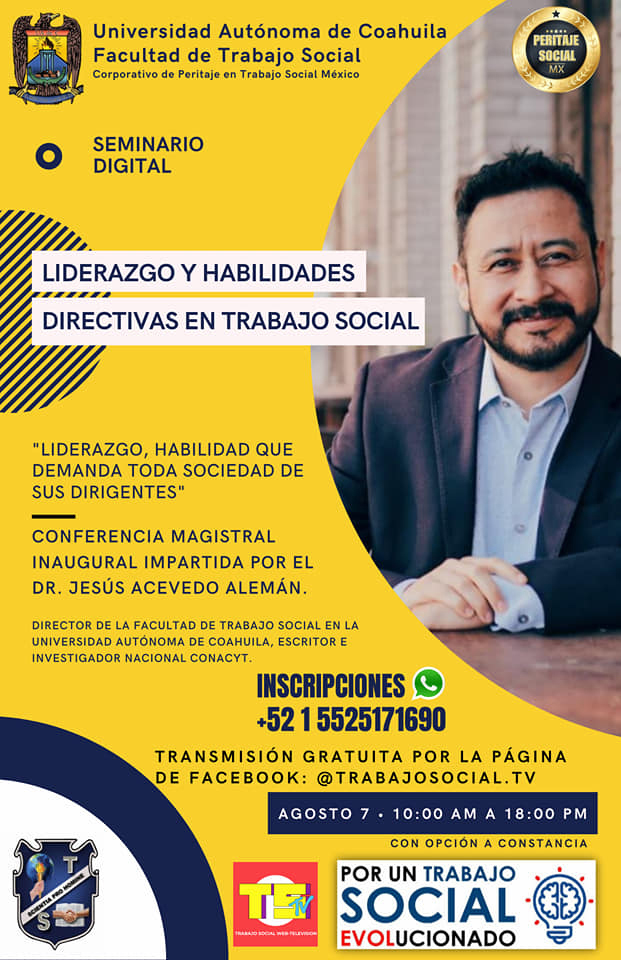 SALTILLO, Coahuila. 3 de agosto de 2021.- En el marco del mes de conmemoración del Día Nacional del Trabajo Social en México, la Universidad Autónoma de Coahuila a través de la Facultad de Trabajo Social, invita al seminario “Liderazgo y Habilidades Directivas en Trabajo Social” que se llevará a cabo el sábado 7 de agosto por medio de Zoom y la página de Facebook: Trabajo Social TV.