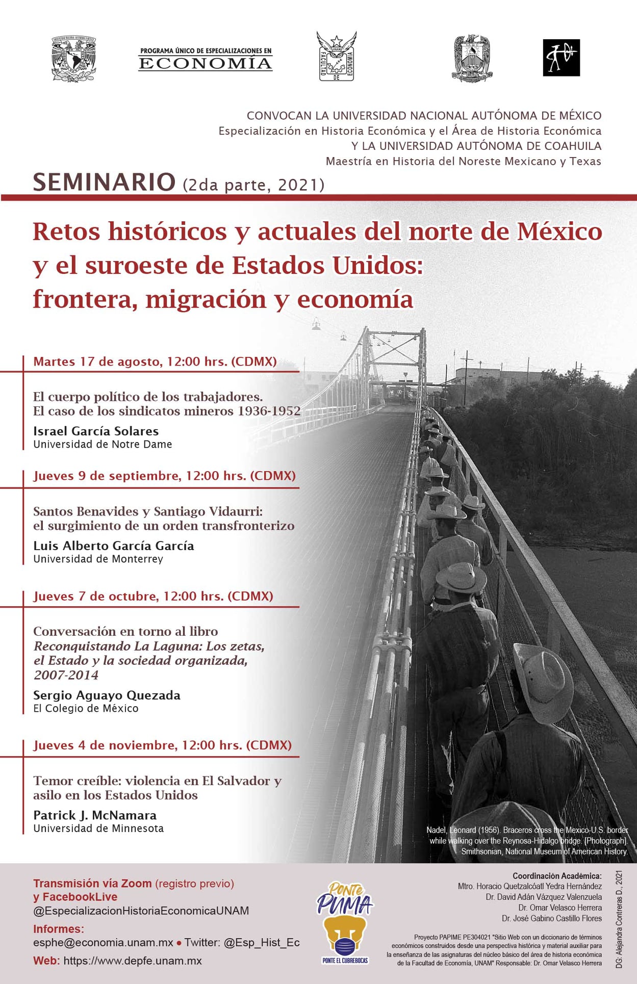 Las actividades del seminario se realizarán durante los meses de agosto, septiembre, octubre y noviembre de 2021 de manera virtual a través de la plataforma Zoom; el evento tiene por objetivo ofrecer un panorama sobre los temas de la frontera, migración y economía en México y Estados Unidos, su desarrollo en el pasado y actualmente.