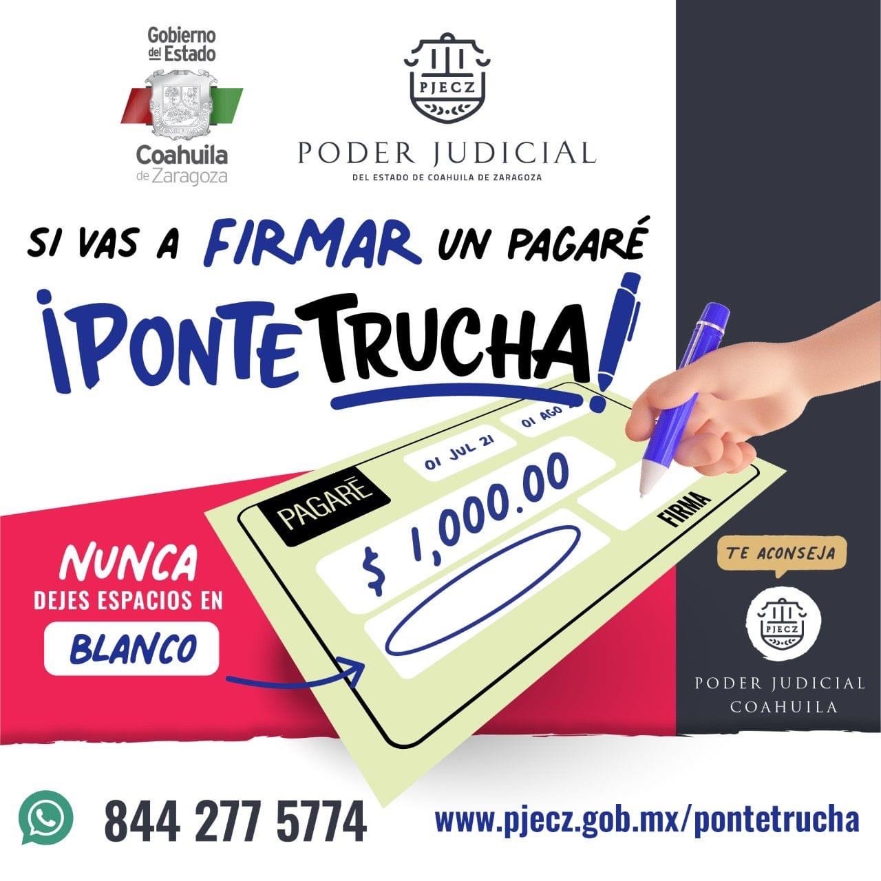 Si vas a firmar un pagaré ¡Ponte Trucha! Revisa todos los elementos para que no seas parte de una estafa. Acércate al Poder Judicial de Coahuila y asesórate. 📲 844 277 5774