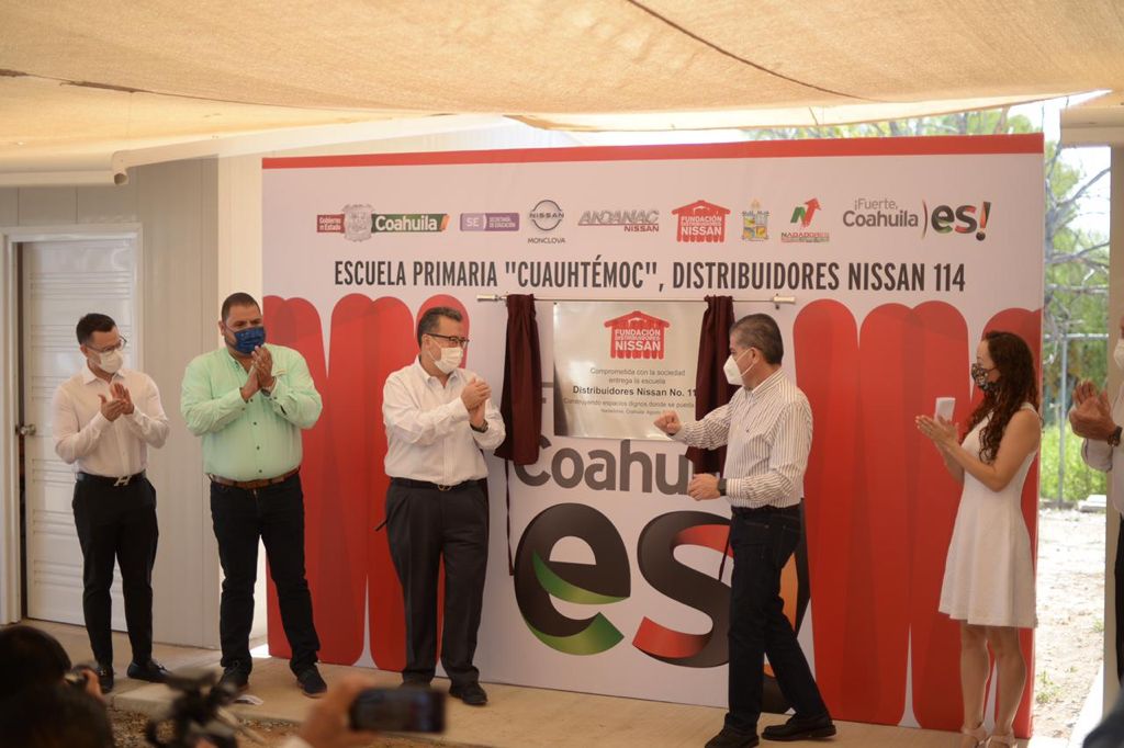 El Mandatario estatal, acompañado de Enrique Zavaleta Ramos, presidente de la Fundación Nissan; Patricio Zabaleta Harb, Gerente General de la Empresa Nissan Monclova, y Patricia Gracía, vicepresidenta de la Fundación Distribuidores Nissan, develaron la placa inaugural de ambas escuelas.