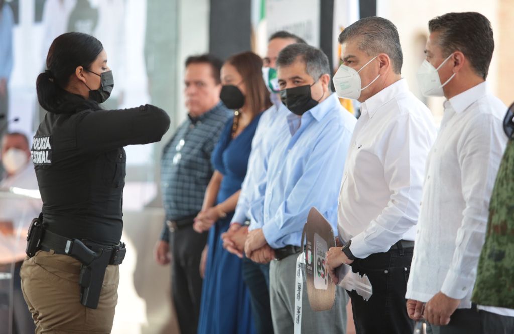 Riquelme Solís reiteró que Coahuila mantendrá su respaldo permanente a las distintas corporaciones estatales con equipamiento de nuevas patrullas, armamento, adiestramiento, capacitación y profesionalización de sus elementos para enfrentar con determinación, valentía y arrojo a grupos de criminales.