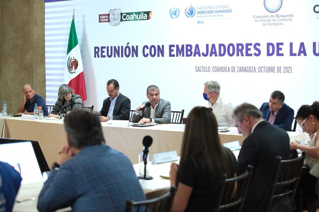 En esta mesa de trabajo, integrantes del Gabinete de la Administración Estatal compartieron con los visitantes de Austria, Portugal, República Checa, España y Francia, el estado que guarda Coahuila en temas de derechos humanos, seguridad, procuración de justicia, migración, desarrollo sostenible y reactivación económica, entre otros.