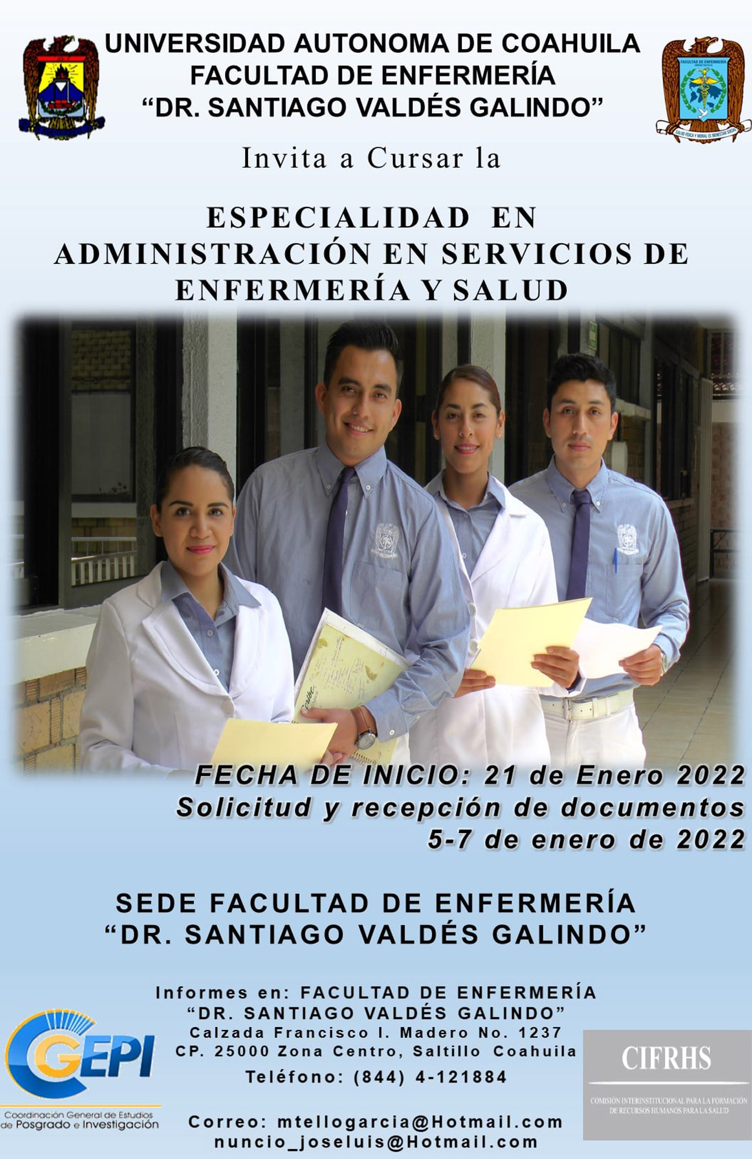 SALTILLO, Coahuila. 9 de diciembre de 2021.- La Facultad de Enfermería “Dr. Santiago Valdés Galindo” de la Universidad Autónoma de Coahuila, convoca a los profesionales de la enfermería a participar en el programa de Especialidad en Administración en Servicios de Enfermería y Salud, cuyas clases iniciarán el 21 de enero de 2022.