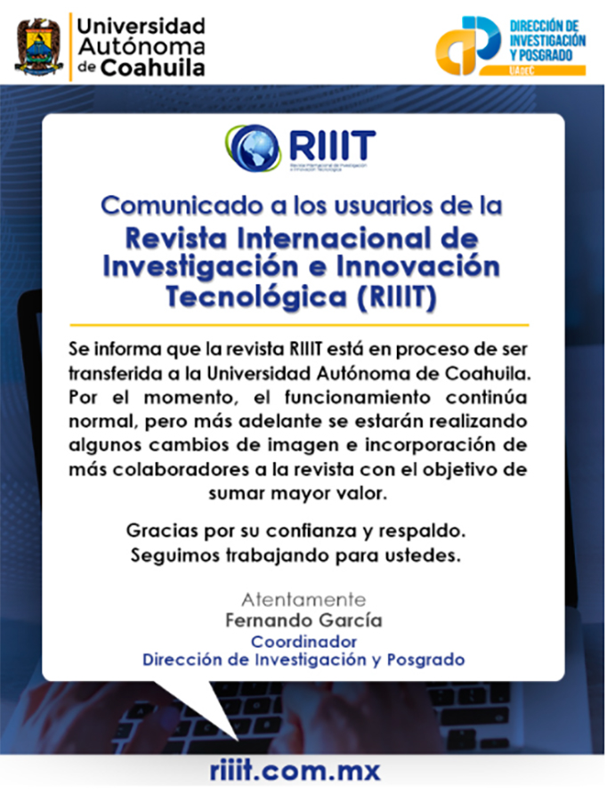 Por su parte, la Revista Internacional de Investigación e Innovación Tecnológica (RIIIT) de la UAdeC, publicada de manera bimestral y digital en https://riiit.com.mx/, ofrece un espacio para nuevo conocimiento creado como resultado de trabajos de investigación con enfoque e impacto tecnológico producido por la comunidad científica, empresarial, gubernamental y de los sectores público y privado.
