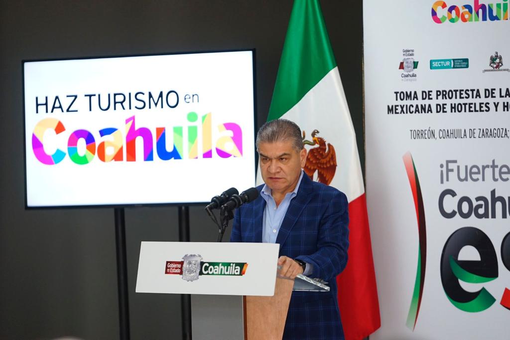 En la toma de protesta de la Asociación Mexicana de Hoteles y Hospedajes acompañaron al gobernador Miguel Riquelme, además, Azucena Ramos Ramos, Secretaria de Turismo y Desarrollo de Pueblos Mágicos del Estado; Roberto Bernal Gómez, Secretario de Salud; funcionarios estatales y municipales, representantes de Cámaras como CANIRAC, y de Universidades de La Laguna.