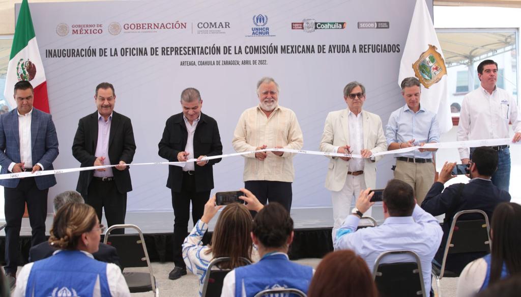 Arteaga, Coahuila de Zaragoza; a 20 de Abril de 2022.- El gobernador Miguel Ángel Riquelme Solís, acompañado por Alejandro Encinas, Subsecretario Federal de Derechos Humanos, Población y Migración, inauguró las oficinas de la Representación de la Comisión Mexicana de Ayuda a Refugiados (COMAR) en Coahuila.Dichas oficinas se encuentran ubicadas en el Centro de Oficinas y Almacenamiento Gubernamental, en el Libramiento Óscar Flores Tapia, en este municipio.