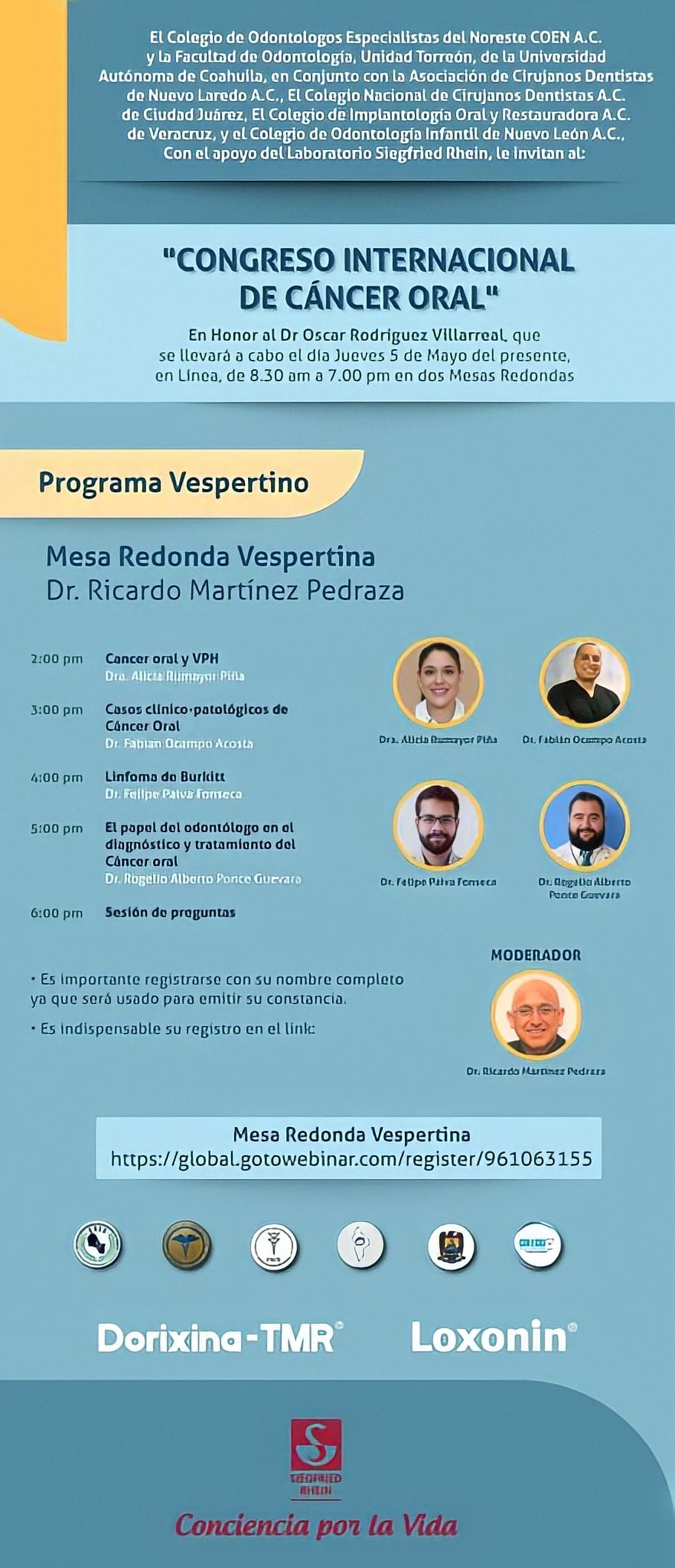 TORREÓN, Coahuila. 3 de mayo de 2022. La Universidad Autónoma de Coahuila a través de la Facultad de Odontología Unidad Torreón en conjunto con el Colegio de Odontólogos Especialistas del Noreste COEN A.C, la Asociación de Cirujanos Dantistas de Nuevo Laredo A.C, el Colegio Nacional de Cirujanos Dentistas A.C de Ciudad Juárez, el Colegio de Implantología Oral y Restauradora A.C de Veracruz y el Colegio de Odontología Infantil de Nuevo León A.C con el apoyo del Laboratorio Siegfried Rhein, invitan al "Congreso Internacional de Cáncer Oral" que se realizará de manera virtual el 5 de mayo de 2022 de 8:30 a 19:00 horas.