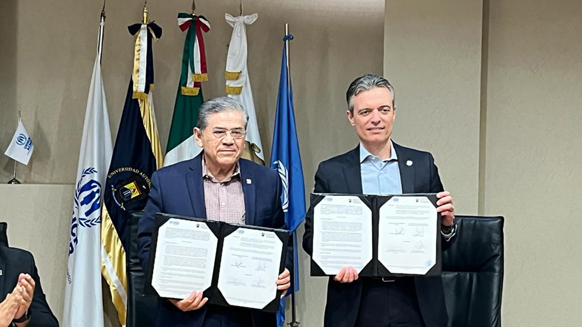Firmaron el documento el rector de la máxima casa de estudios, Salvador Hernández Vélez y el representante de ACNUR en México, Giovanni Lepri, acompañados por el titular de la Coordinación General de Vinculación e Innovación Productiva, Octavio Pimentel Martínez, la coordinadora de la Defensoría de los Derechos Humanos Universitarios, Magda Yadira Robles Garza, la coordinadora de Unidad Torreón, Sandra López Chavarría, el Oficial Mayor, Luis Gutiérrez y la Jefa de Oficina de ACNUR en Saltillo, Coahuila, Ana Lorena Galindo Cepeda.