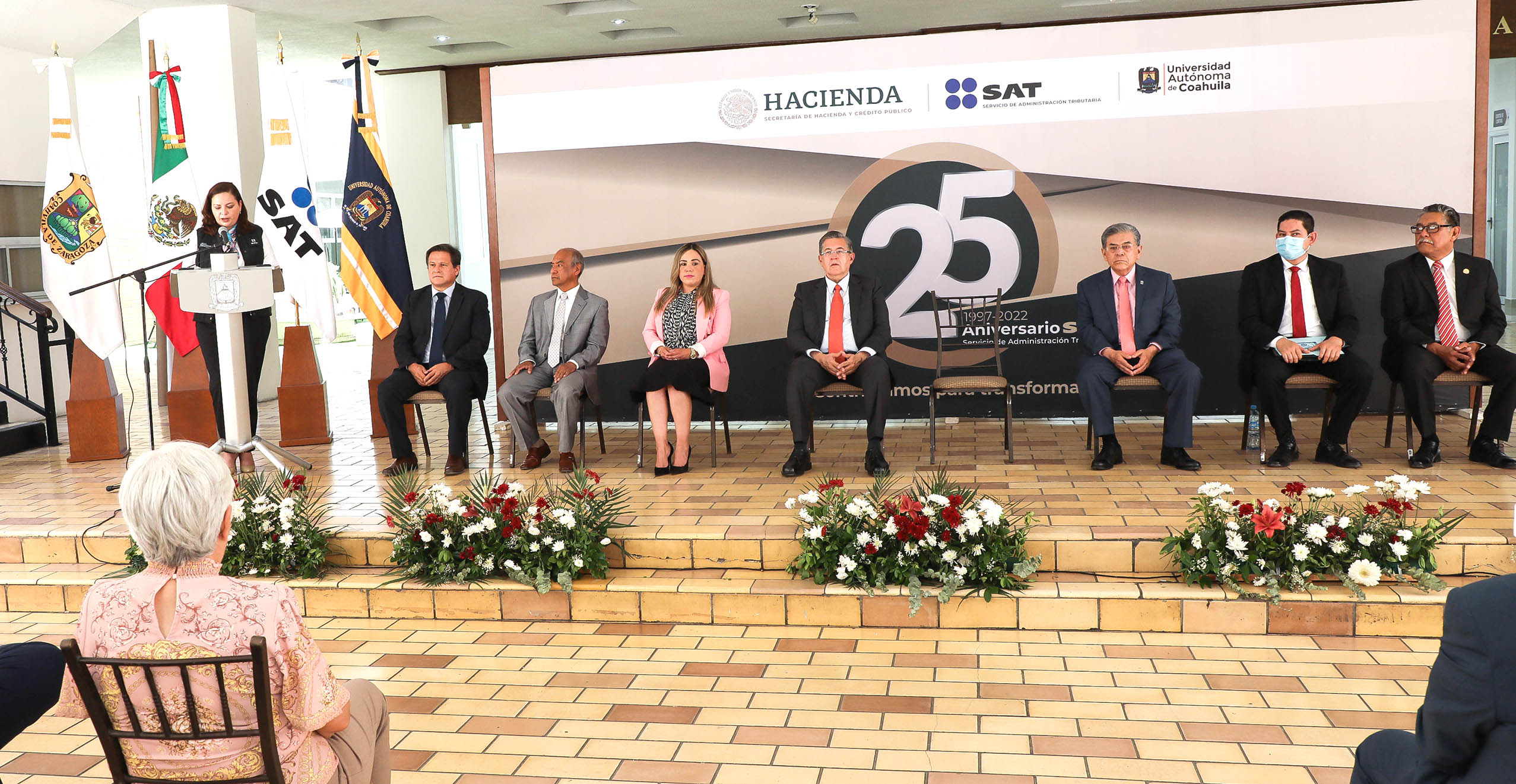 Lo anterior, en la Facultad de Jurisprudencia de la UAdeC en donde se llevó a cabo la ceremonia y develación de placa por el 25 Aniversario del SAT, a la que asistieron la Administradora General Jurídica, y egresada de la máxima casa de estudios, Guadalupe Araceli García Martínez, en representación de Raquel Buen Rostro Sánchez jefa del Servicio de Administración Tributaria en el país.