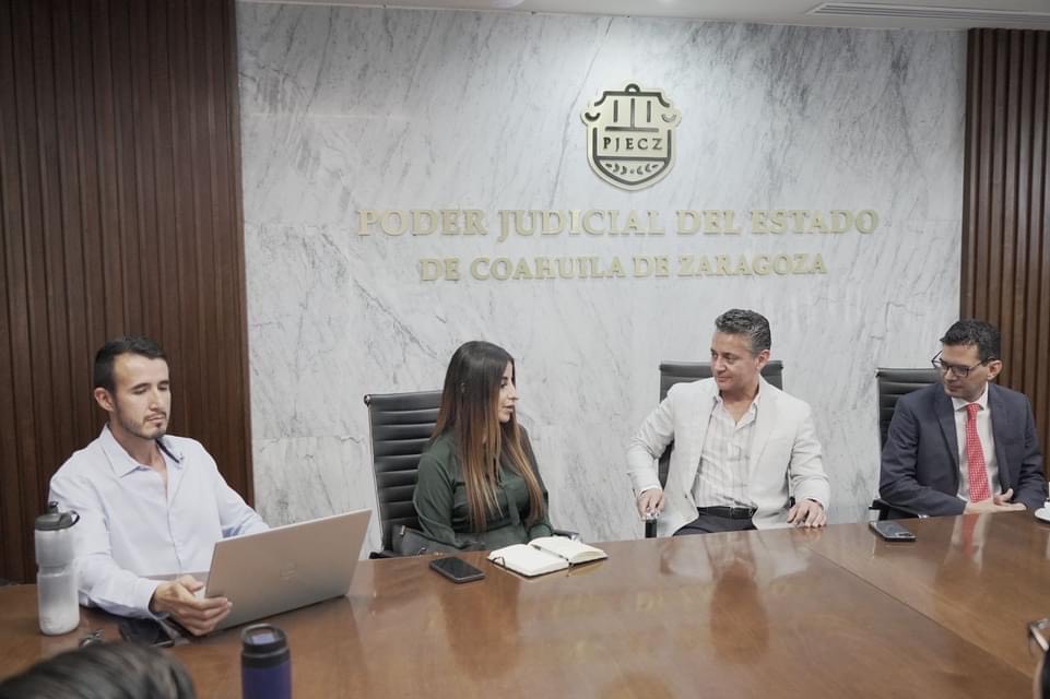 - El Magistrado Presidente, Miguel Mery Ayup, Christel Rosales y Jorge Carvajal de México Evalúa en reunión de trabajo sobre las buenas prácticas que ha impulsado el Poder Judicial de Coahuila para el avance en el Sistema de Justicia.