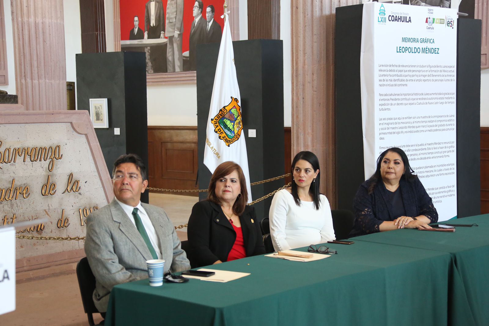 Saltillo, Coahuila 12 julio 2022.- Como parte del trabajo coordinado entre el Congreso del Estado de Coahuila y el gobierno del estado, a través de la Secretaría de Cultura para fomentar la difusión del acervo cultural, este día se inauguró en el recinto legislativo la memoria gráfica "En honor a Benito Juárez" del pintor y grabador Leopoldo Méndez, en el marco del 150 aniversario luctuoso del también considerado Benemérito de las Américas, evento que contó con la participación de las diputadas María Eugenia Calderón Amezcua, coordinadora de la Comisión de Educación del Congreso local, Luz Elena Morales Núñez, presidenta de la Diputación Permanente, Martha Loera Arámbula, coordinadora de la Comisión de Presupuesto, Javier René Castrejón, director de documentación e información legislativa de este Congreso, y el Dr. Andrés Mendoza Salas, director de Museos e Historia, en representación de la secretaria de cultura en el estado, Ana Sofía García Camil.