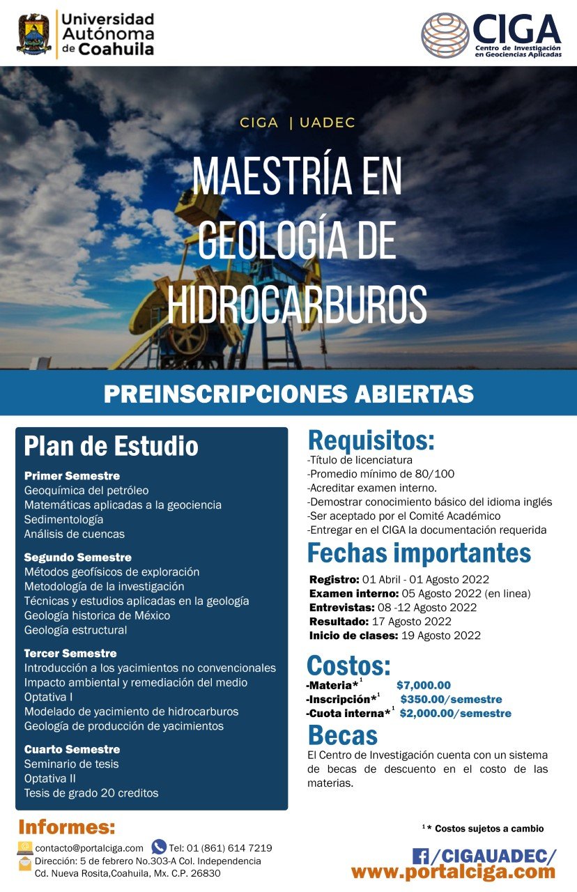 NUEVA ROSITA, Coahuila. 15 de julio de 2022.- Si eres egresado de nivel licenciatura en el área de Ciencias de la Tierra o afines, con o sin experiencia laboral e interés en la investigación, manejo de las Tecnologías de la Información (TIC) y conocimiento del idioma inglés, a nivel de lectura y comprensión de textos, la Maestría en Geología de Hidrocarburos que ofrece el Centro de Investigación en Geociencias Aplicadas CIGA de la Universidad Autónoma de Coahuila, es para ti.