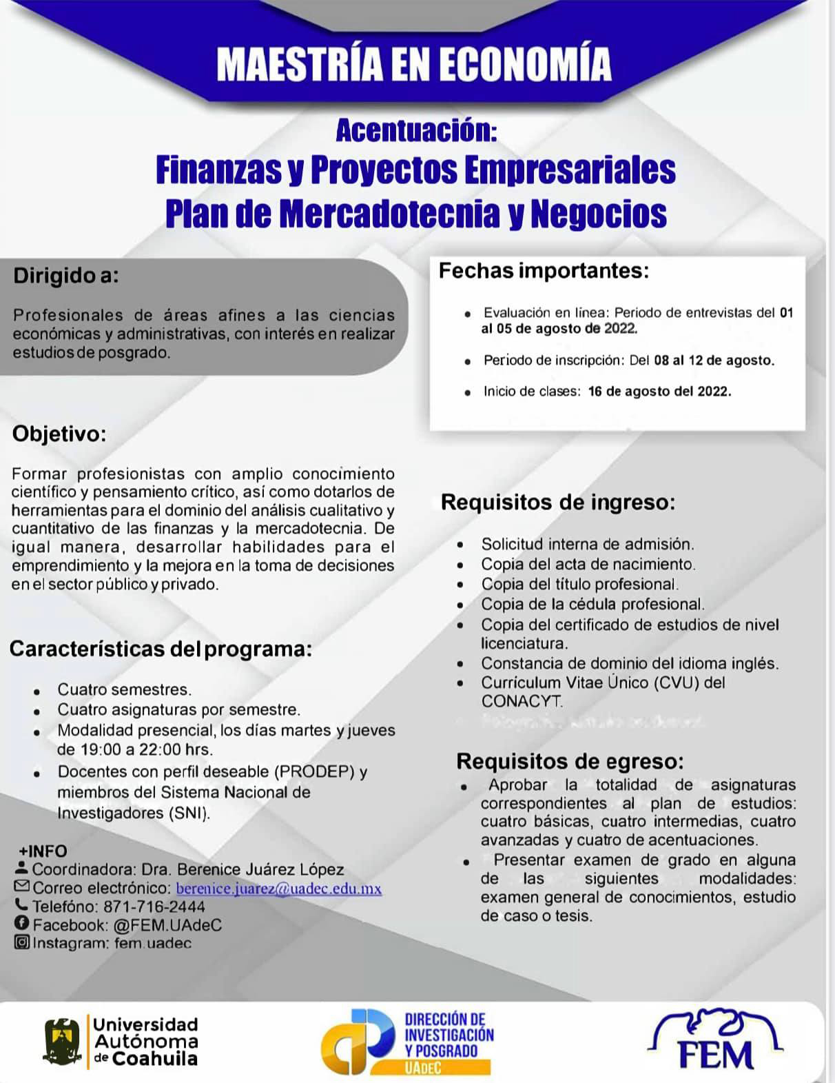 Para más información, comunicarse con la coordinadora del posgrado, Dra. Berenice Juárez López al correo electrónico Esta dirección de correo electrónico está siendo protegida contra los robots de spam. Necesita tener JavaScript habilitado para poder verlo., o llamar al teléfono (871) 716 24 44 o bien, consultar la convocatoria publicada en la página de Facebook “Facultad de Economía y Mercadotecnia”.