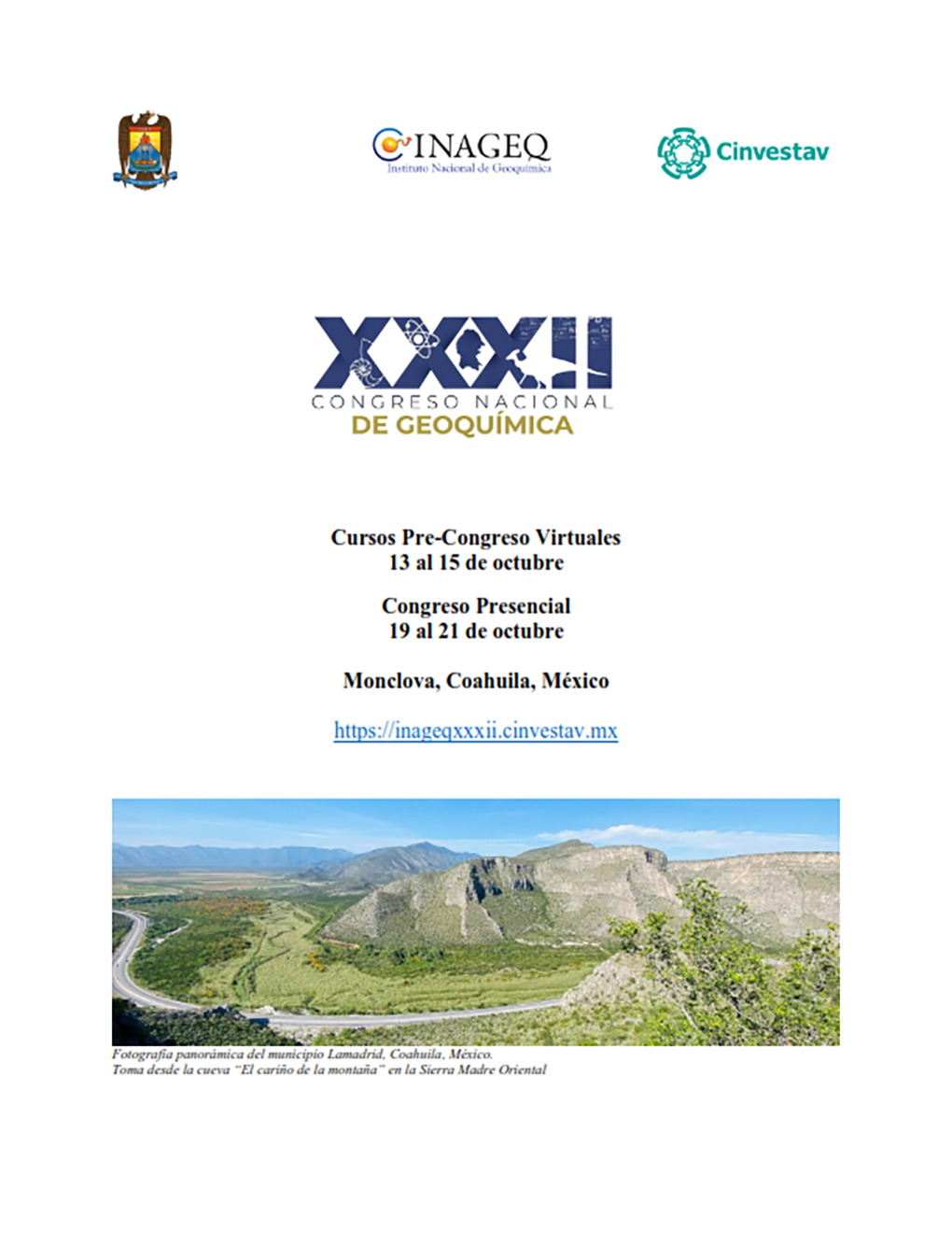 SALTILLO, Coahuila. 25 de julio de 2022.- La Universidad Autónoma de Coahuila en colaboración con el Instituto Nacional de Geoquímica A.C. (INAGEQ) y el CINVESTAV Unidad Saltillo, invitan a la comunidad de investigación en ciencias de la tierra y ciencias afines a la química de los sistemas terrestres, a participar en el XXXII Congreso Nacional de Geoquímica-INAGEQ 2022, que se llevará a cabo del 13 al 15 de octubre de 2022 para los cursos pre-congreso en modalidad virtual por Microsoft Teams y del 19 al 21 de octubre de 2022 de forma presencial en la Sala de Seminarios de la Unidad Norte de la UAdeC en la ciudad de Monclova, Coahuila.