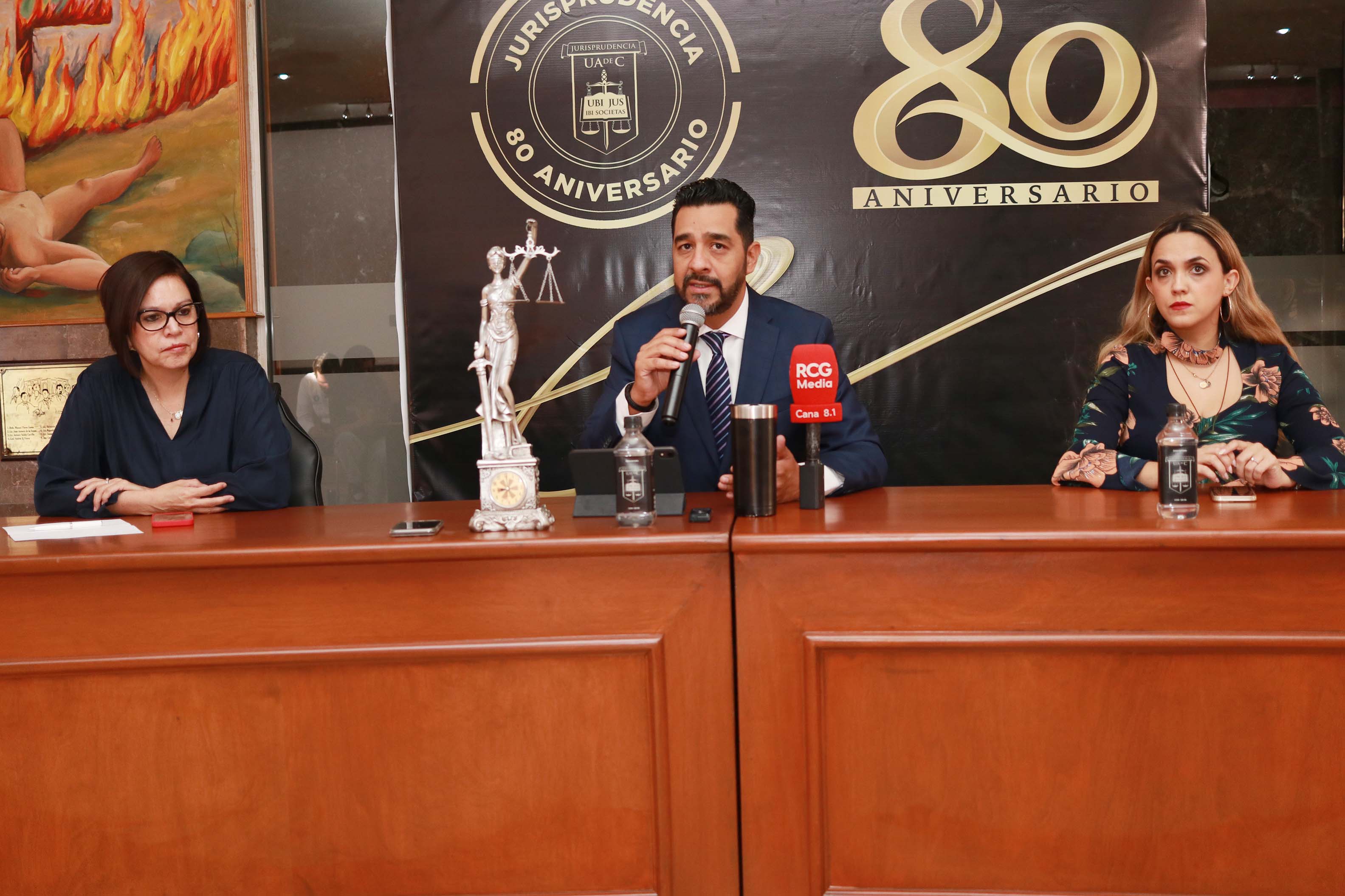 SALTILLO, Coahuila. 8 de agosto de 2022. Integrantes del Comité del 80 Aniversario de la Facultad de Jurisprudencia de la Universidad Autónoma de Coahuila, dieron a conocer las actividades para conmemorar “80 años Haciendo Historia”, a desarrollarse a partir del mes de agosto de 2022 y hasta el 30 de abril de 2023.