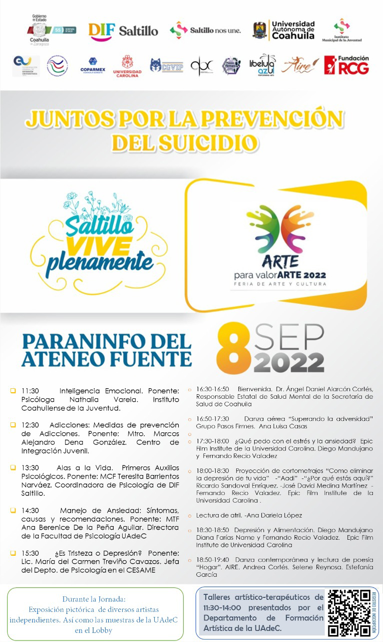 El evento es en colaboración con la Universidad Carolina, la Secretaría de Salud, la Comisión de Salud Fronteriza Mx-EUA Oficina Coahuila, el Instituto Coahuilense de la Juventud, Centro de Salud Mental, DIF Saltillo, Centro de Integración Juvenil la Coparmex Coahuila Sureste, los colectivos: Pasos Firmes, Libélula Azul y AIRE, así como la Facultad de Psicología, el Ateneo Fuente, y las coordinaciones de Vinculación e Innovación Productiva, General de Extensión Universitaria y de Difusión y Patrimonio Cultural.