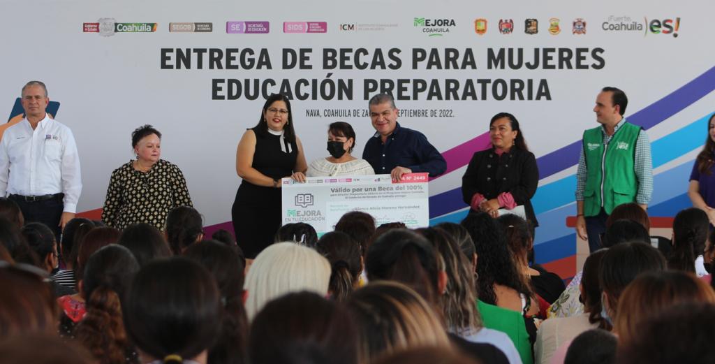 Nava, Coahuila de Zaragoza; a 8 de Septiembre de 2022.- Cerca de 400 becas del Programa para Mujeres Preparatoria Gratuita, así como una techumbre en el CBTIS 239, entregó el gobernador Miguel Ángel Riquelme Solís en el Municipio de Nava, como parte de una gira de trabajo por la Región de los Cinco Manantiales, donde también puso en marcha obras de agua potable y recarpeteo por más de 21 millones de pesos.
