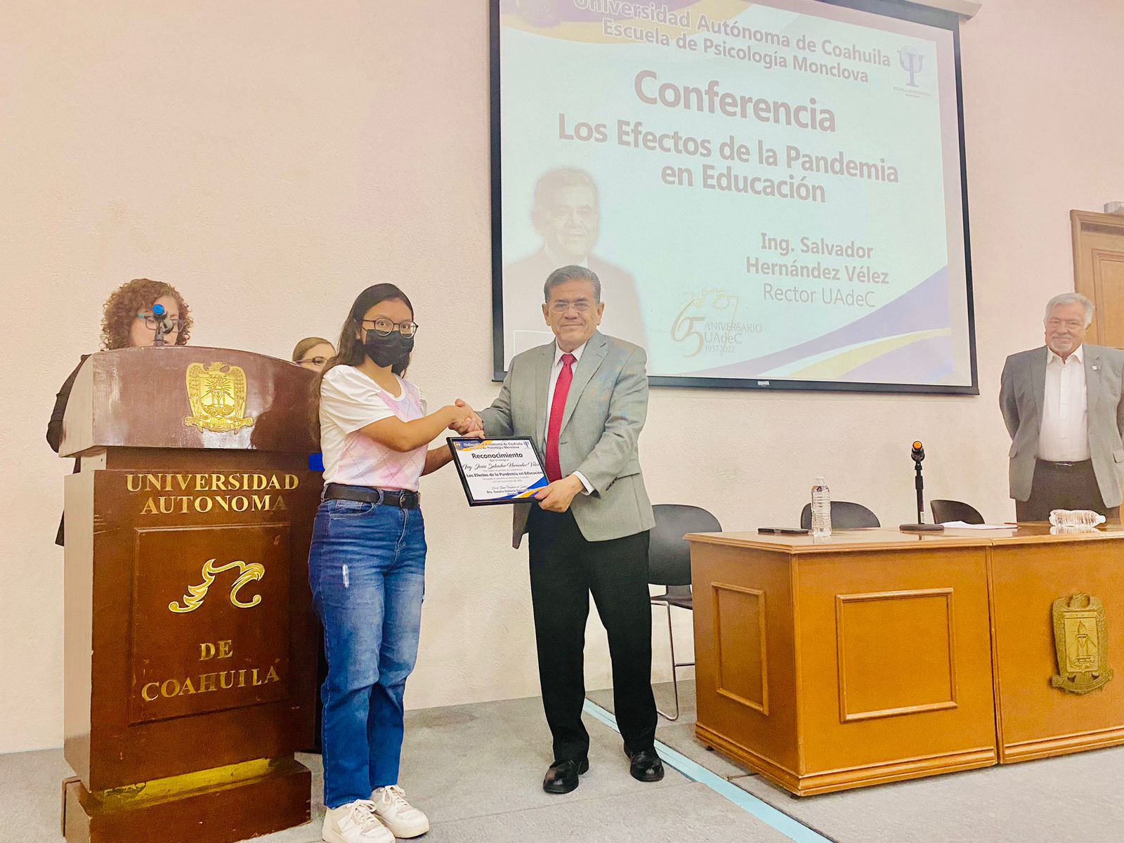Hizo énfasis en que aún quedan muchos desafíos en el proceso educativo, los cuales se podrán superar siempre y cuando se cuente con una educación de calidad, así como un compromiso firme y entrega de docentes y estudiantes; al finalizar el evento la Escuela de Psicología le entregó un reconocimiento al rector Salvador Hernández Vélez por impartir la charla.