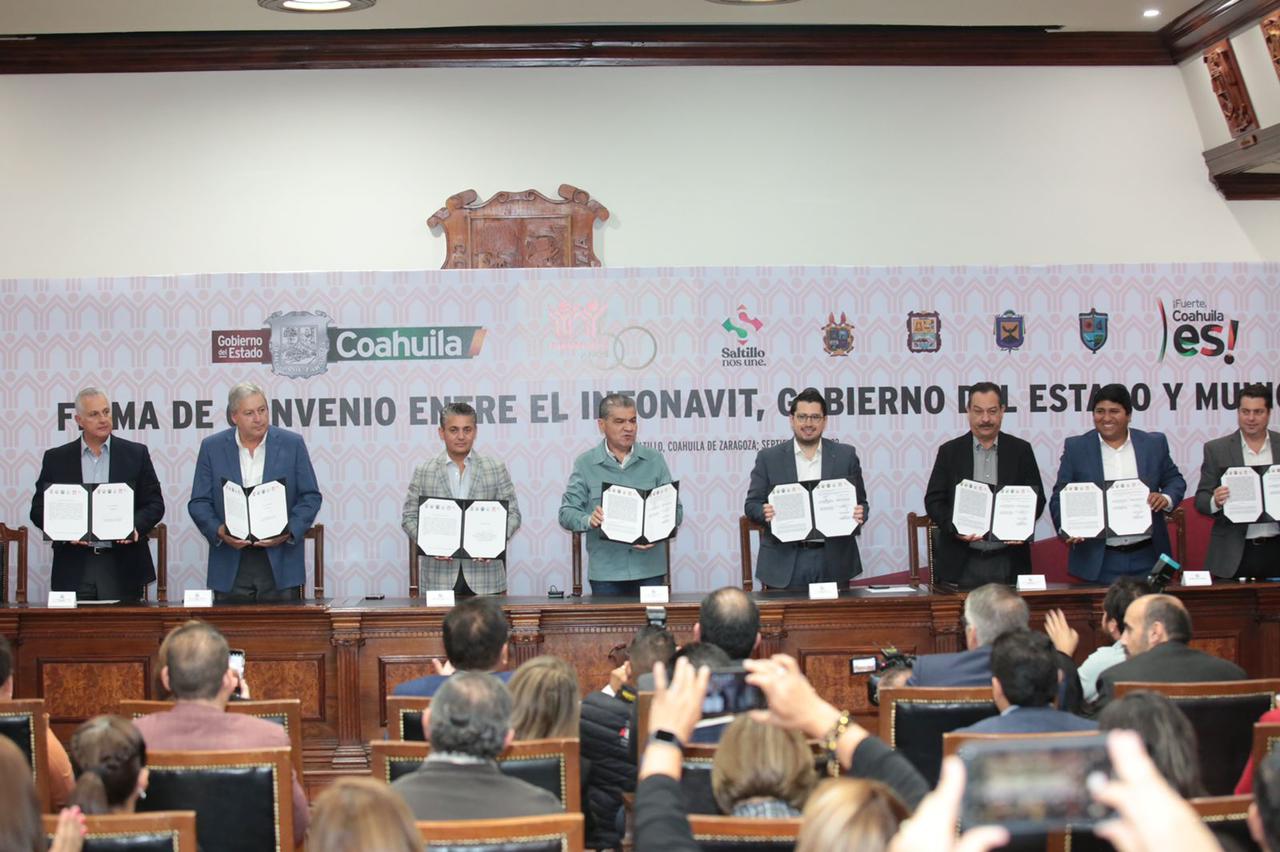 Saltillo, Coahuila, a 29 de septiembre de 2022.- Con los objetivos de garantizar el acceso de las y los coahuilenses a una vivienda adecuada y darles seguridad jurídica sobre su patrimonio, el Instituto del Fondo Nacional de la Vivienda para los Trabajadores (Infonavit) firmó un convenio de colaboración con el Gobierno de Coahuila y los municipios de Acuña, Piedras Negras, Saltillo y Torreón, para facilitar la recuperación de vivienda abandonada y la regularización de escrituras.