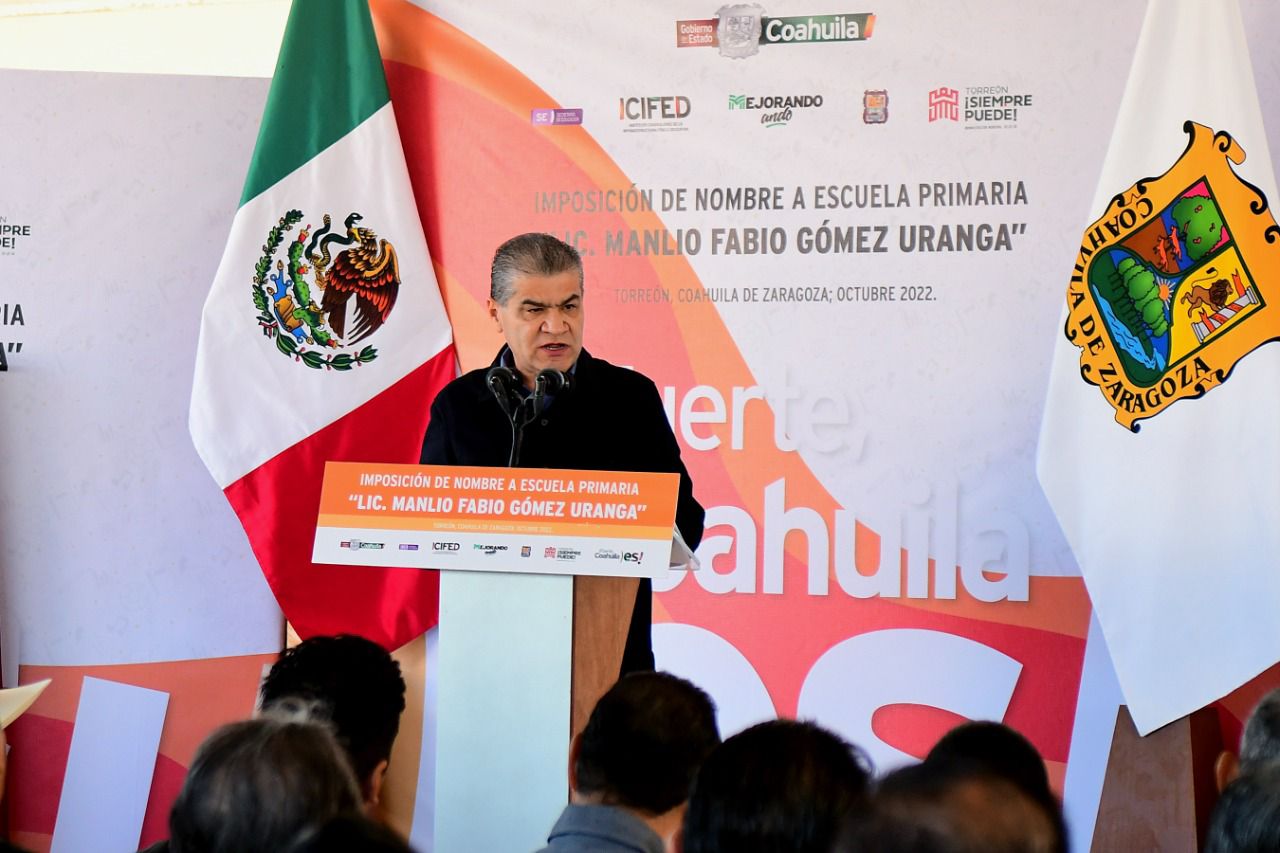 Torreón, Coahuila de Zaragoza; a 10 de Octubre de 2022.- El gobernador Miguel Ángel Riquelme Solís impuso el nombre "Lic. Manlio Fabio Gómez Uranga" a una escuela primaria en Torreón, que fue equipada y se le realizó obra exterior con inversión superior a los 2 millones de pesos.
